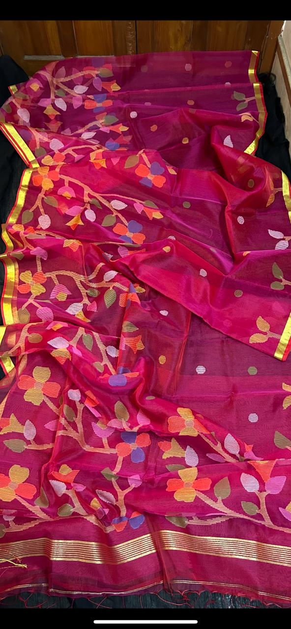 Moslin saree is made by fine cotton count embellished by extra warp designs with multi coloured yarns. It is a simple formation of cotton saree & woven with figured motifs, in transparent plain ground, with designs of extra warp in borders and extra weft in the body. Use of cotton yarn make it suitable to wear comfortably.