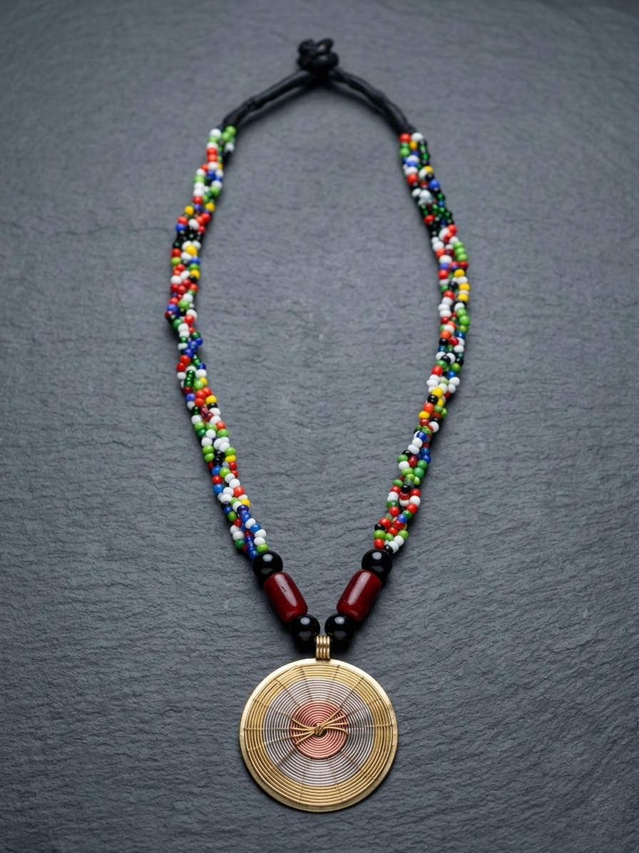 Celebrate the beauty of tradition with this stunning handcrafted necklace, designed to make a bold yet graceful statement. Featuring a vibrant blend of multicolored beads intricately woven together, this piece reflects the rich artistry of tribal craftsmanship.The highlight of this necklace is its striking circular pendant, adorned with a mesmerizing concentric design in earthy tones and metallic accents.
