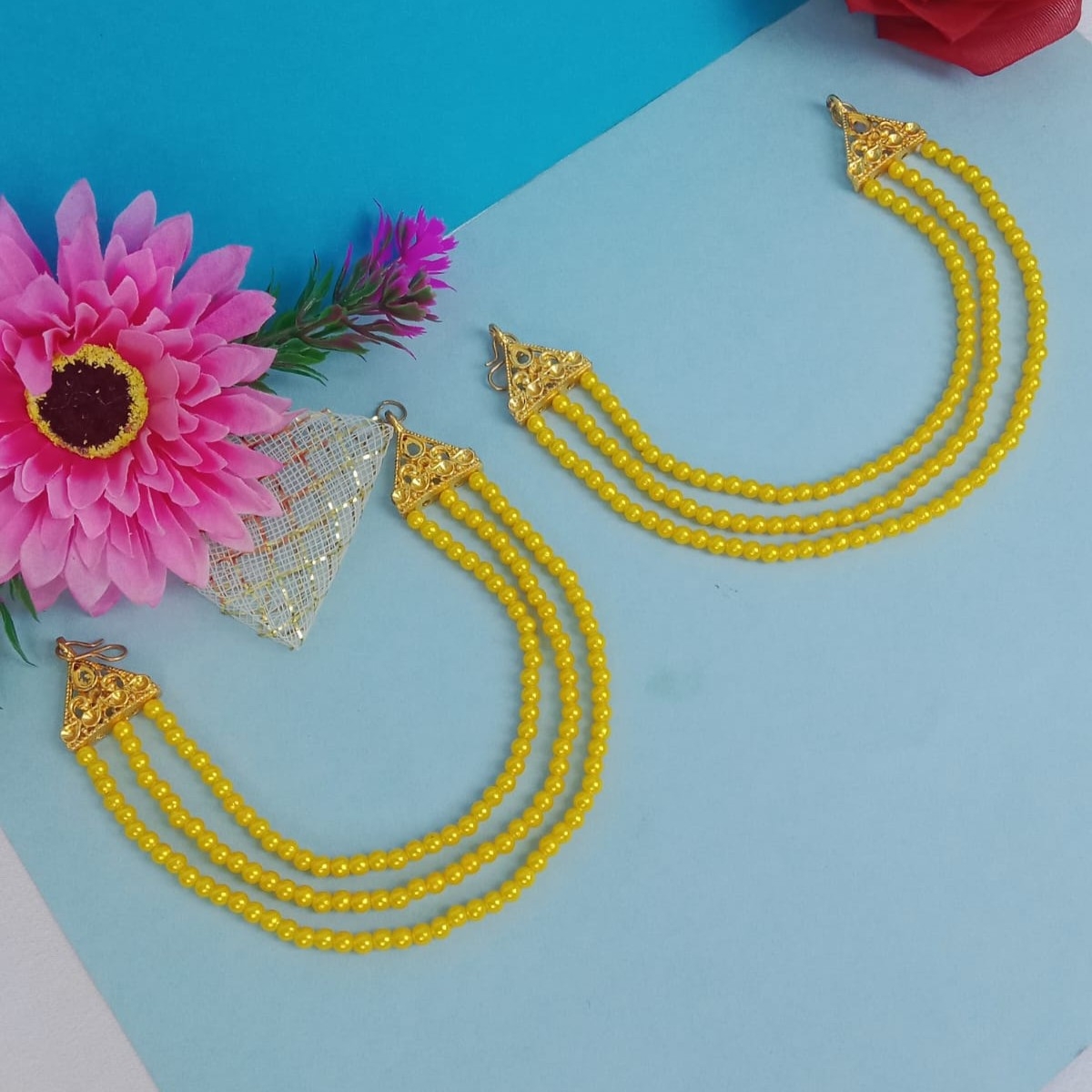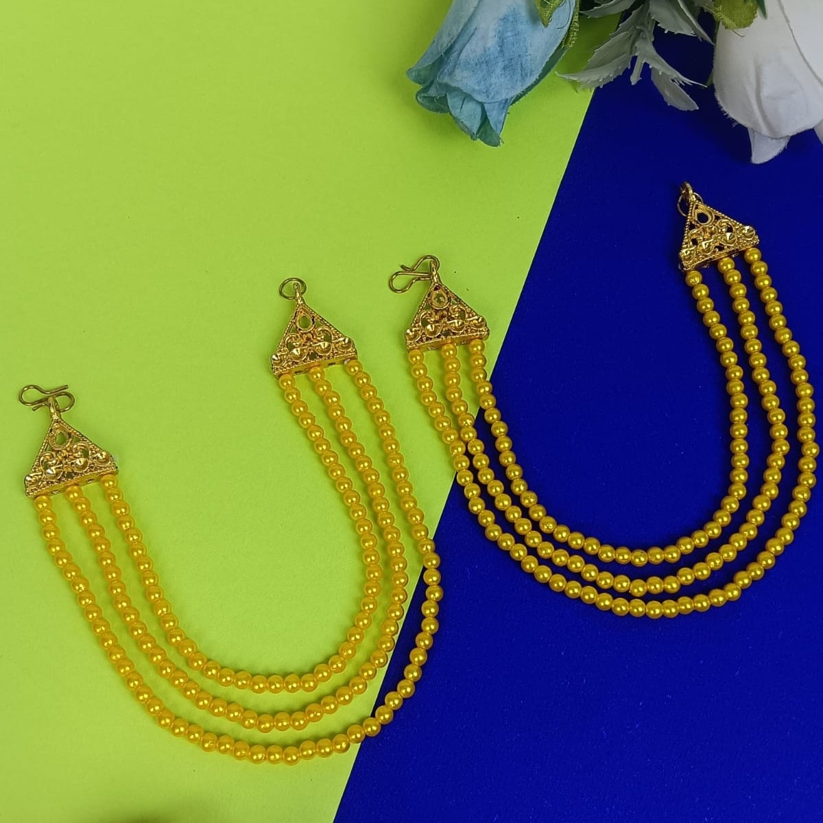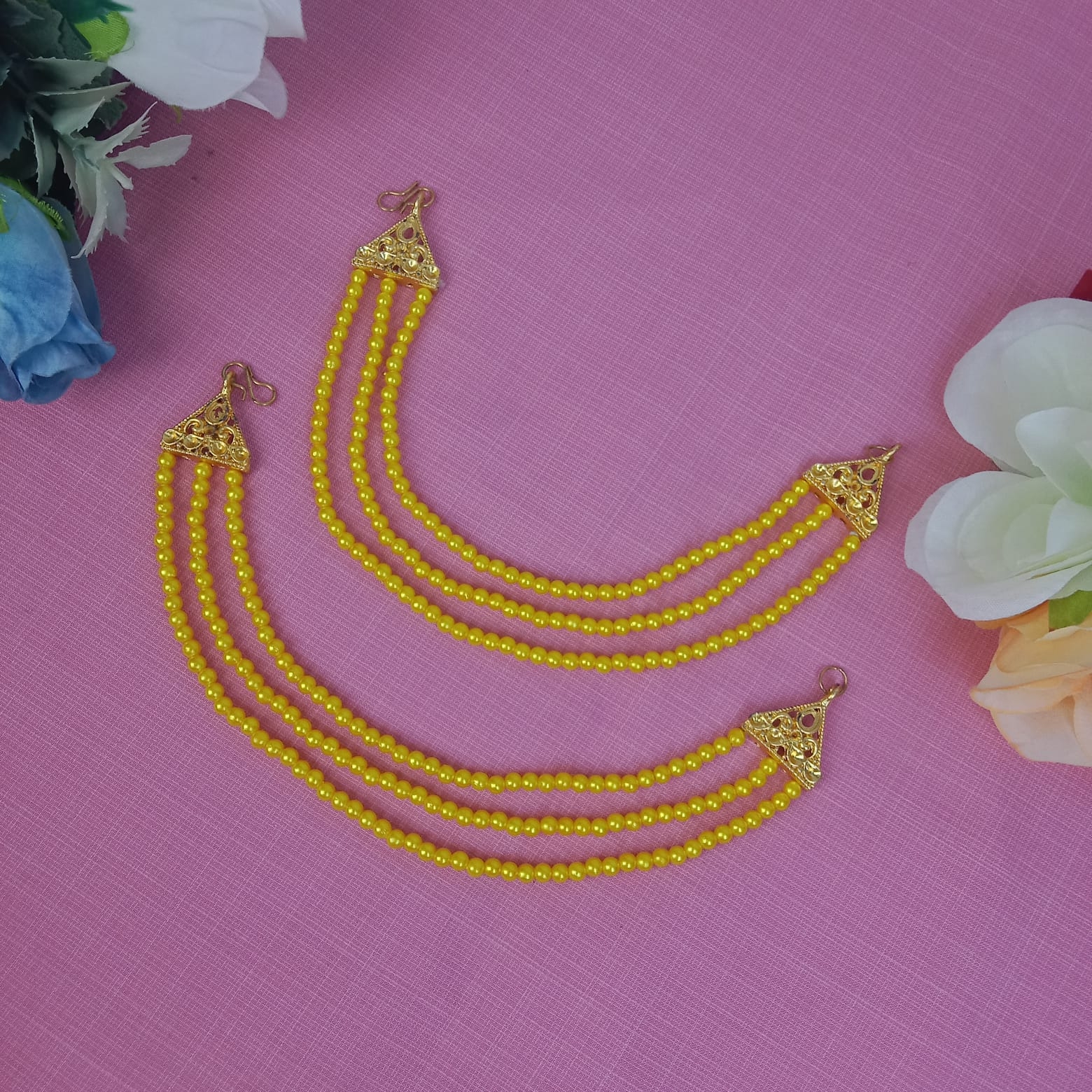 Enhance your traditional look with this multi-layered ear chain set, designed with a refined gold-tone finish, vibrant yellow beads, and artificial stone accents. The structured three-strand design creates a smooth and balanced drape from ear to hair, adding elegance without overwhelming your overall style.