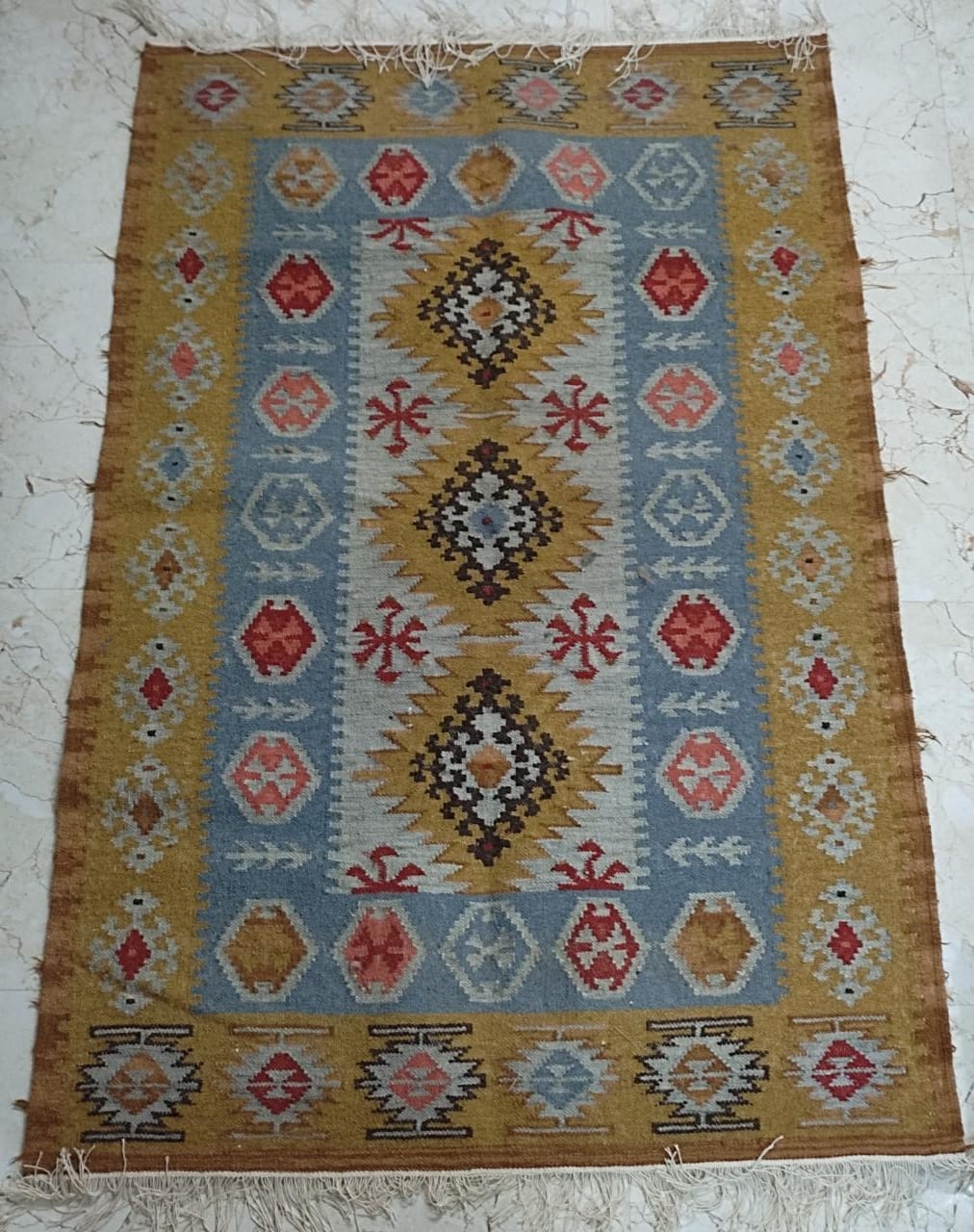 Woolen durry woven on vertical loom & easy to carry. Biodegradable & can be washed by plain water with little soda to remove dirt can be cleaned by vaccum cleaner. It should be kept in roll when not in use.