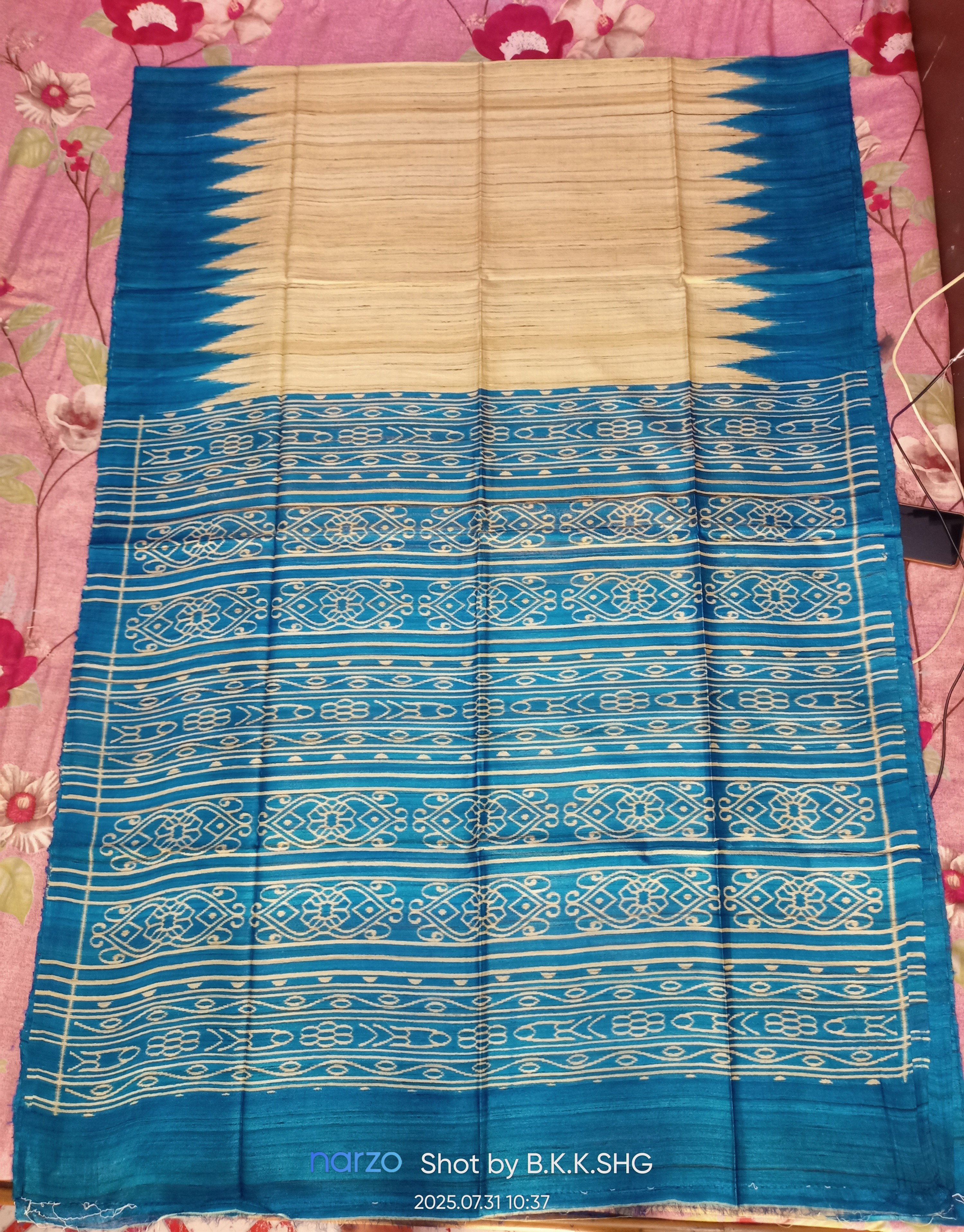 Tasar by ghicha silk saree ,width-45 inch,lenth-6.30 cm,warp- mulberry Tasar ,weft- ghicha Yarn , design - ekkat print fhiroza colour Reed-62