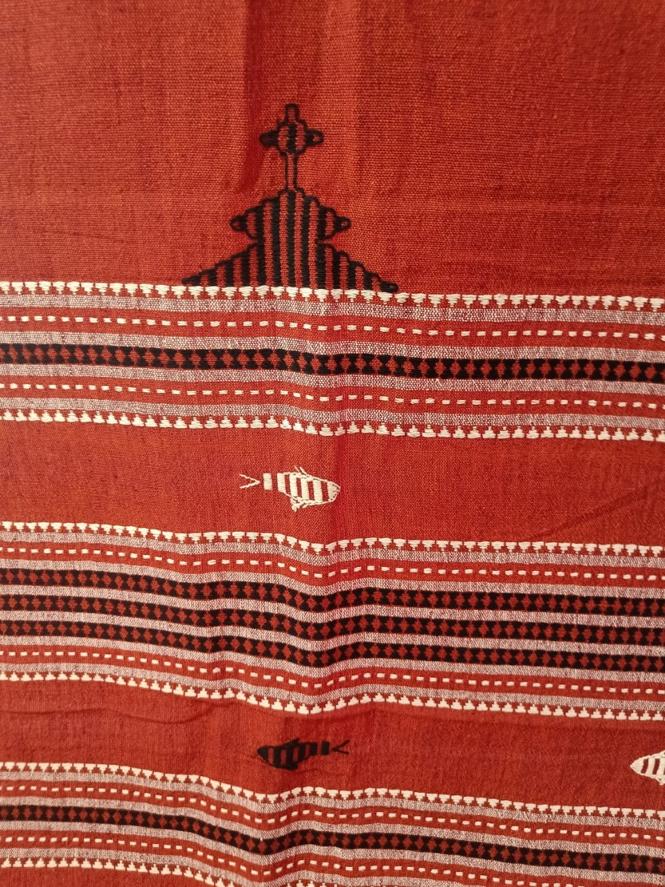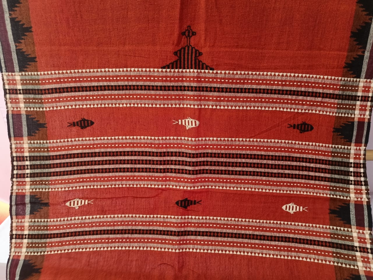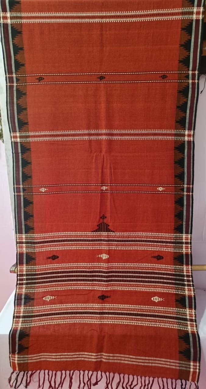 Natural (Aal) Dyed Kotpad Dupatta has been woven in Pit loom by the Tribal Communities located in Kotpad, Koraput, Odisha. This Dupatta has been woven in coarser cotton with tribal design motifs. Aal dyed extract from the root bark of Aal Tree which gives deep reddish maroon shades. It is very fast to wash & this natral dyed technique only practice in Koraput district of Odisha, India.