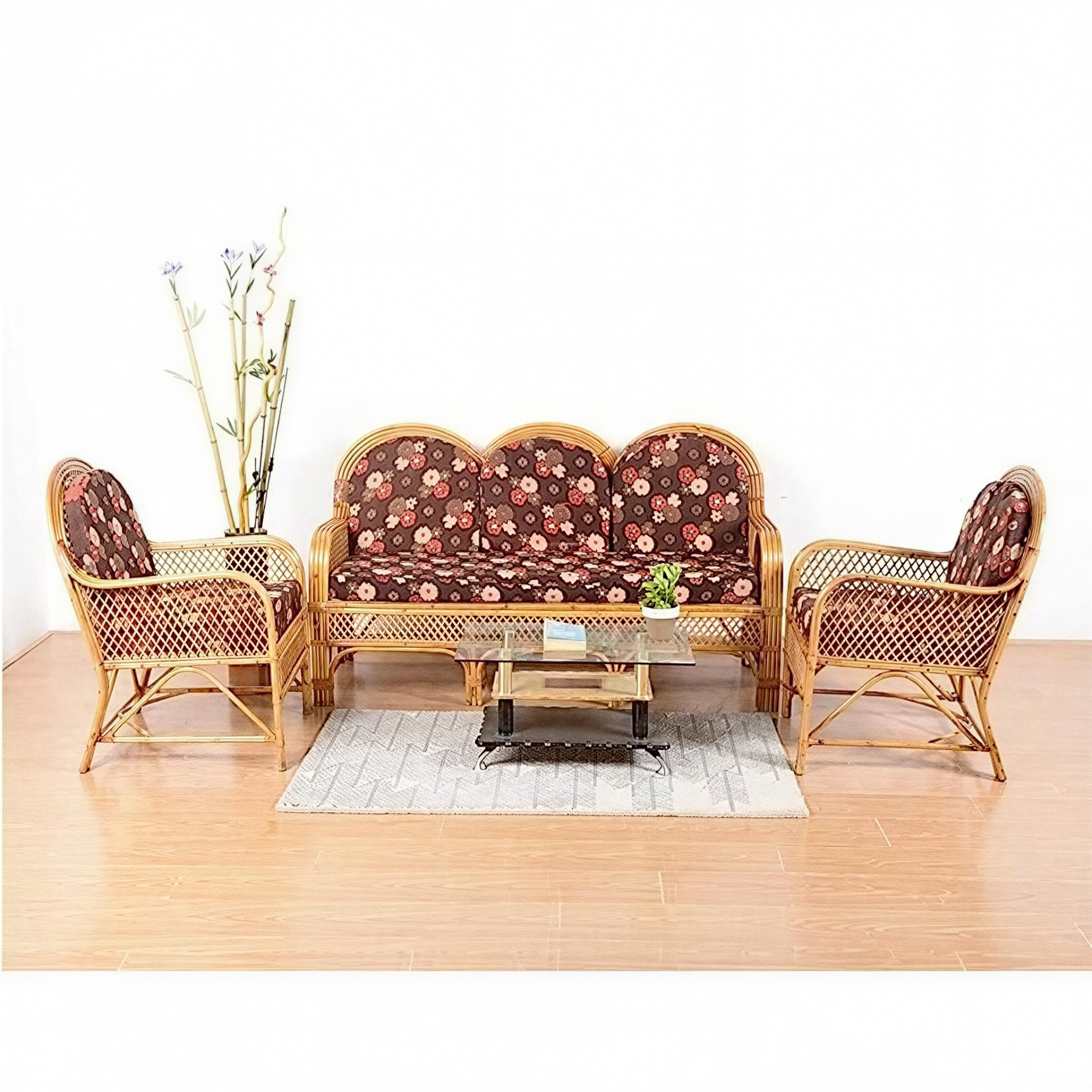 Natural Rattan Cane 3 Seater Sofa Set and 2 Single Seater Chair with Cushions (Brown)
