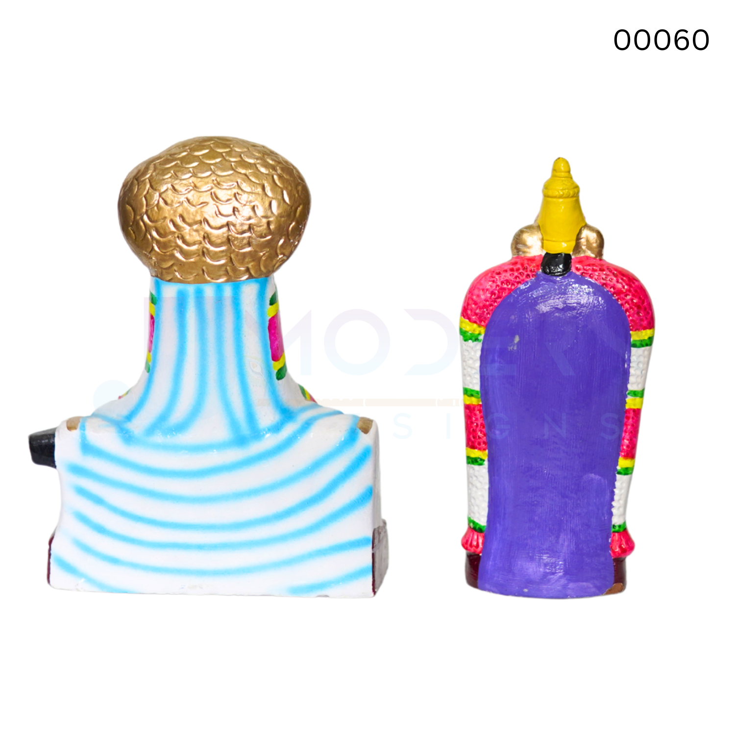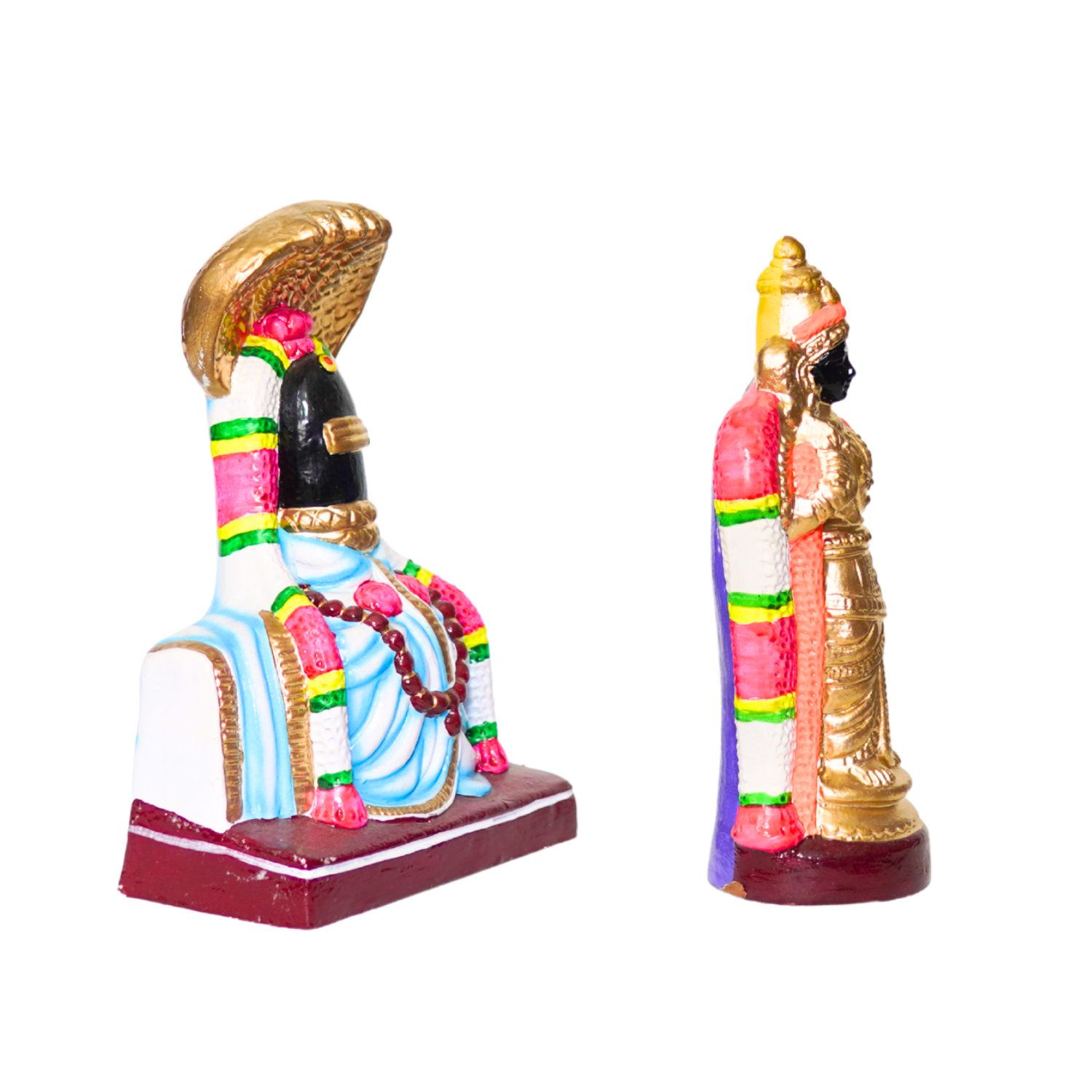 Handcrafted Nellaiappar Gandhimathi 9-inch Clay Doll, representing the divine couple of Tirunelveli temple. Made from traditional clay, this piece is vibrantly hand-painted and reflects authentic South Indian artistry. Perfect for Navaratri Golu displays, festive décor, or as a devotional collectible, it preserves cultural heritage with elegance and devotion.