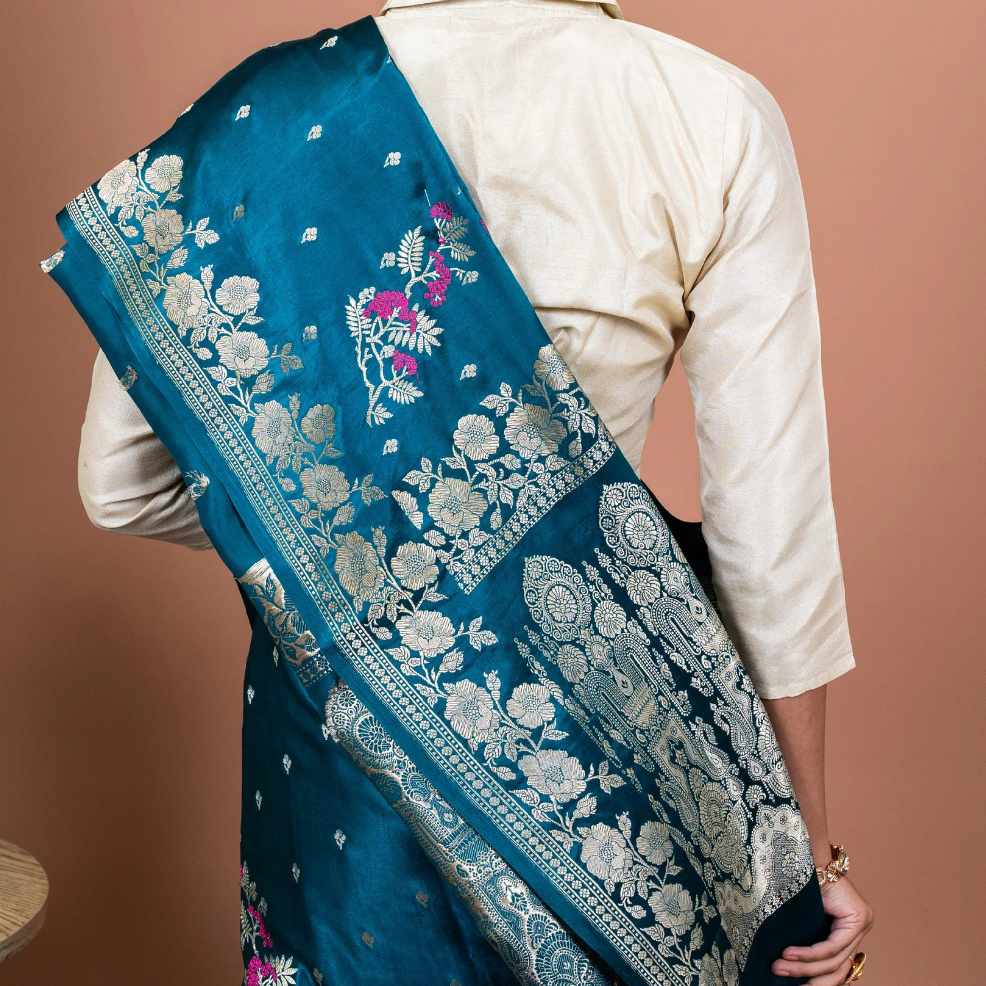Experience the serene elegance of the Nirvana Handwoven Banaras Saree in a soothing turquoise shade. Each saree is meticulously handwoven by skilled artisans using age-old Banarasi techniques, bringing a story of cultural richness to life. Its delicate motifs and versatile design make it ideal for both intimate gatherings and grand celebrations. Lightweight yet luxurious, this saree not only enhances your presence but also becomes a treasured heirloom, capturing timeless beauty and heritage in every fold. Embrace the legacy of tranquility, elegance, and craftsmanship with Nirvana.