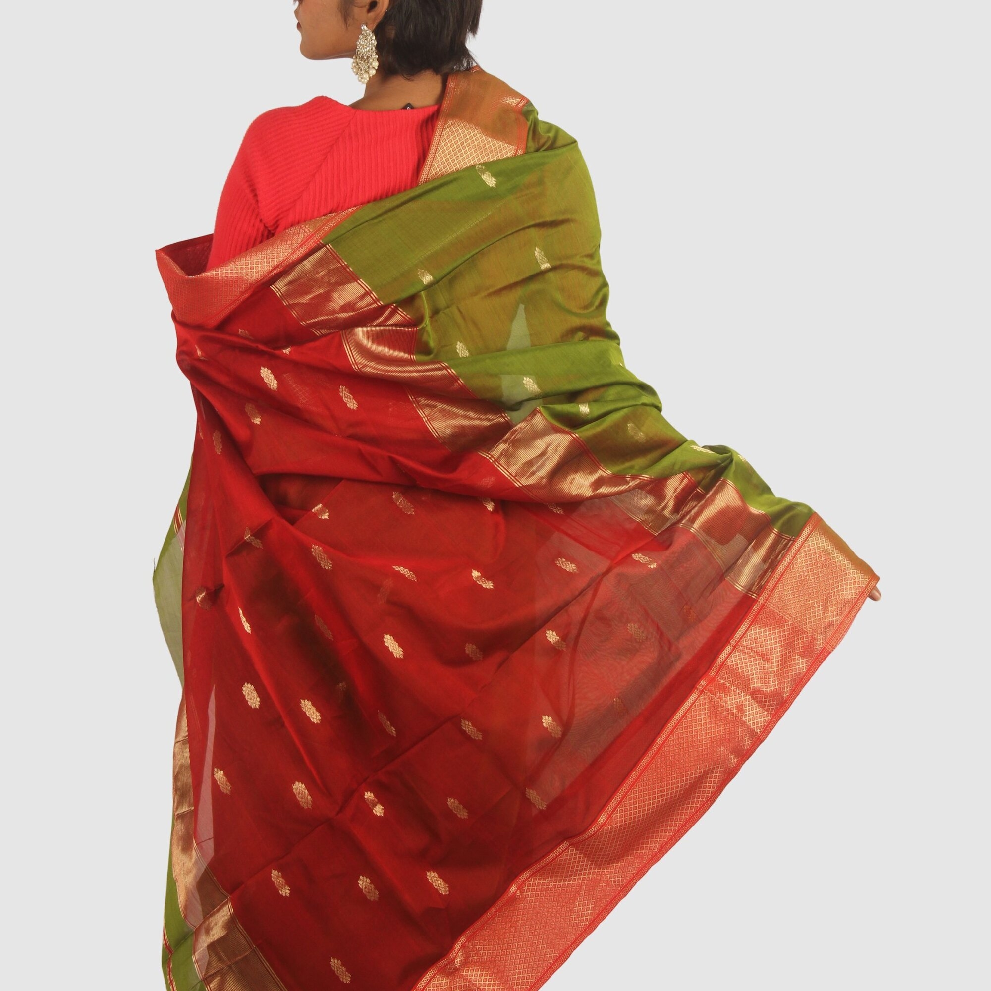 Grace meets tradition in this beautifully handwoven Maheshwari saree crafted in Maheshwar, Madhya Pradesh. Designed in an elegant olive green shade, it features a refined diamond zari border complemented by delicate golden khat buti motifs across the body. The rich red pallu enhances its festive charm while maintaining timeless sophistication.