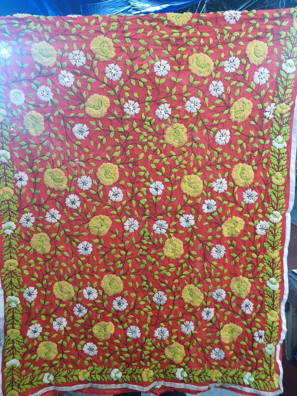 Orange base white yellow flower design Georgette Phulkhari Duppatta