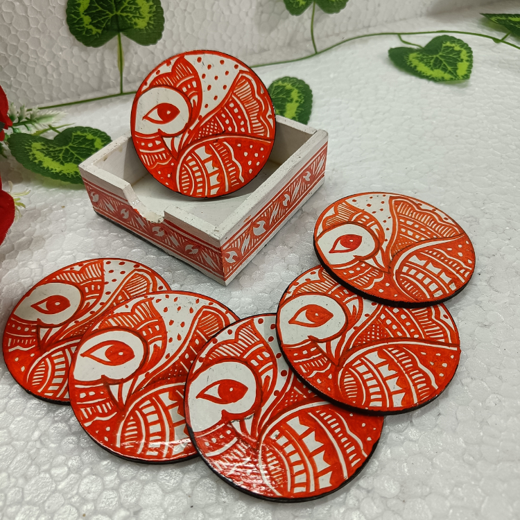 Add a touch of traditional elegance to your space with this beautifully handpainted Madhubani coaster set. Crafted on durable MDF wood, each coaster features intricate artwork inspired by folk art, bringing vibrant colors and cultural charm to your table. The set includes 6 coasters with a matching holder for neat storage. Perfect for protecting surfaces from heat and stains while enhancing your home décor, it also makes a thoughtful and artistic gift.