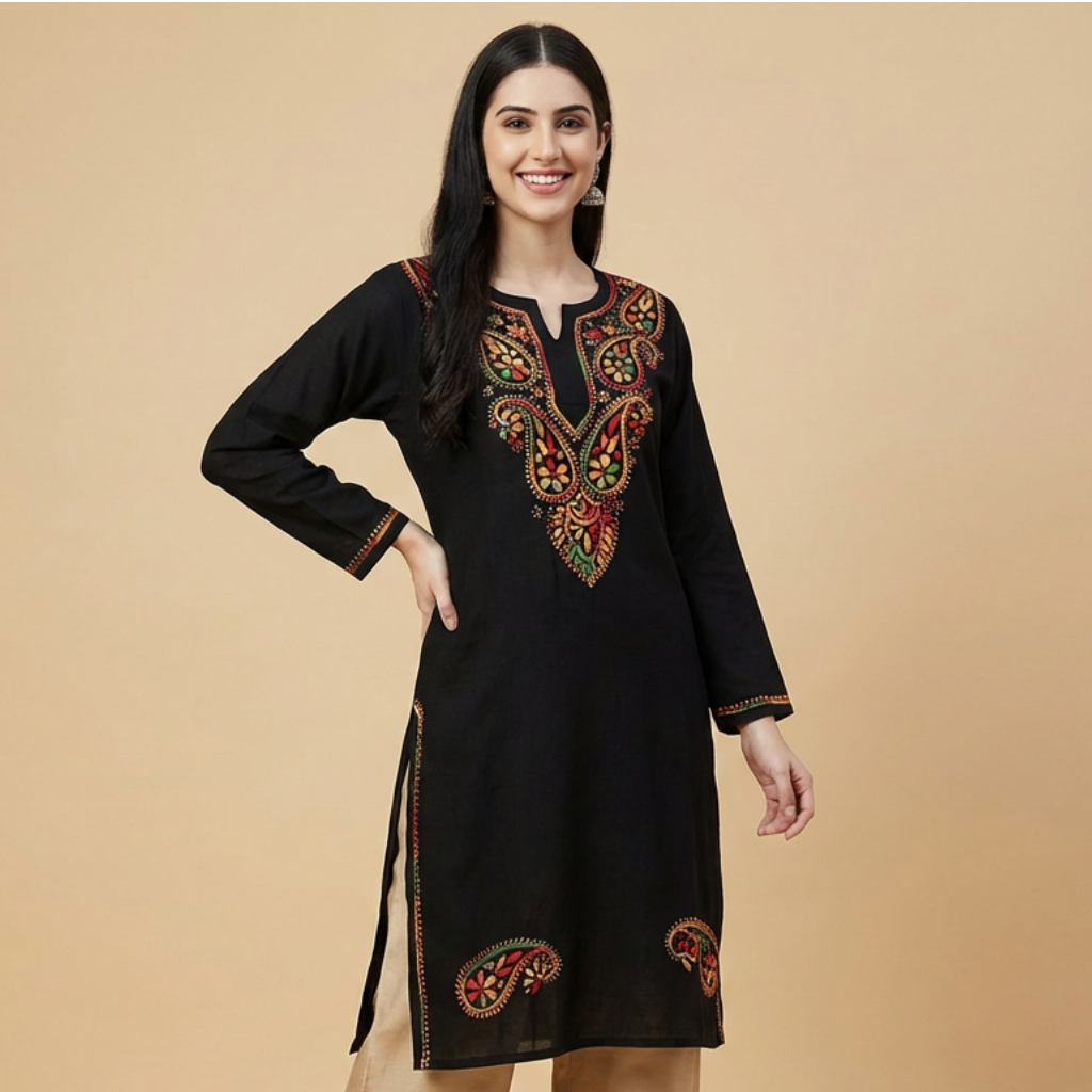 This is a black kurti featuring intricate hand embroidery, combining elements of Lucknowi Chikankari and Kashmiri Aari work. The colorful embroidery, including floral and paisley motifs, is prominently displayed around the neckline and extends to the sleeves and hem. Made from soft and breathable fabric, such as cotton or rayon, it is designed for both comfort and style, suitable for various occasions.