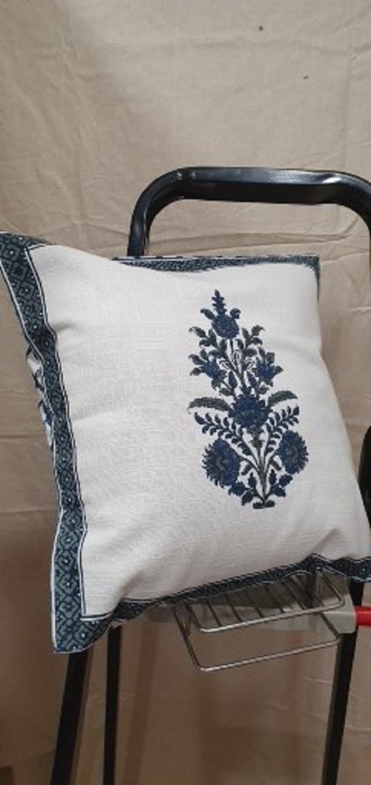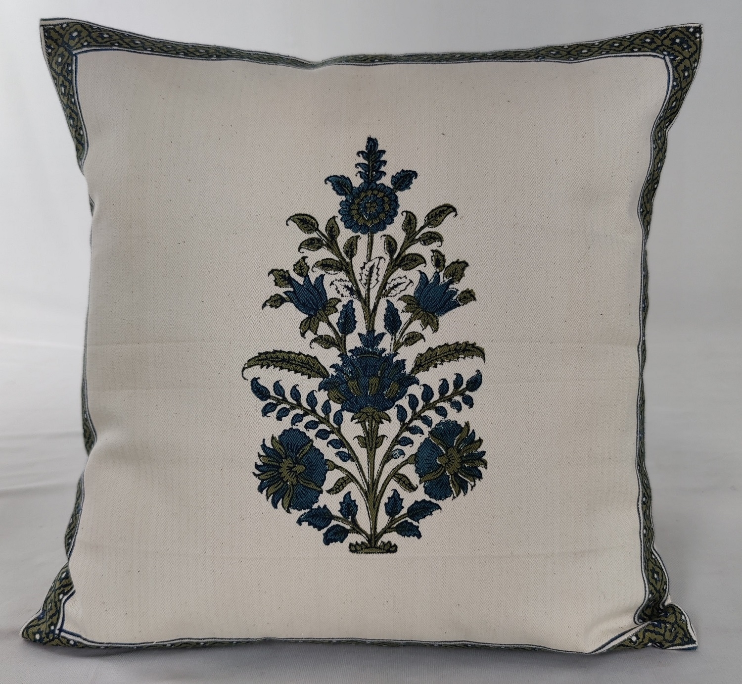 Add some color and style to your sofa, bed, or chair with the beautiful cushion cover, made of high-quality cotton. Indian heritage with this exquisite Mughal Buta Cushion Cover. Featuring detailed floral in royal blue and olive green, inspired by traditional Mughal art, this cover brings a refined, timeless elegance to your living space. Made with premium ivory cotton and bordered with fine printed piping, this cushions are ideal for both contemporary and traditional interiors. Handcrafted with precision by skilled artisans, it reflects India’s rich craft legacy.