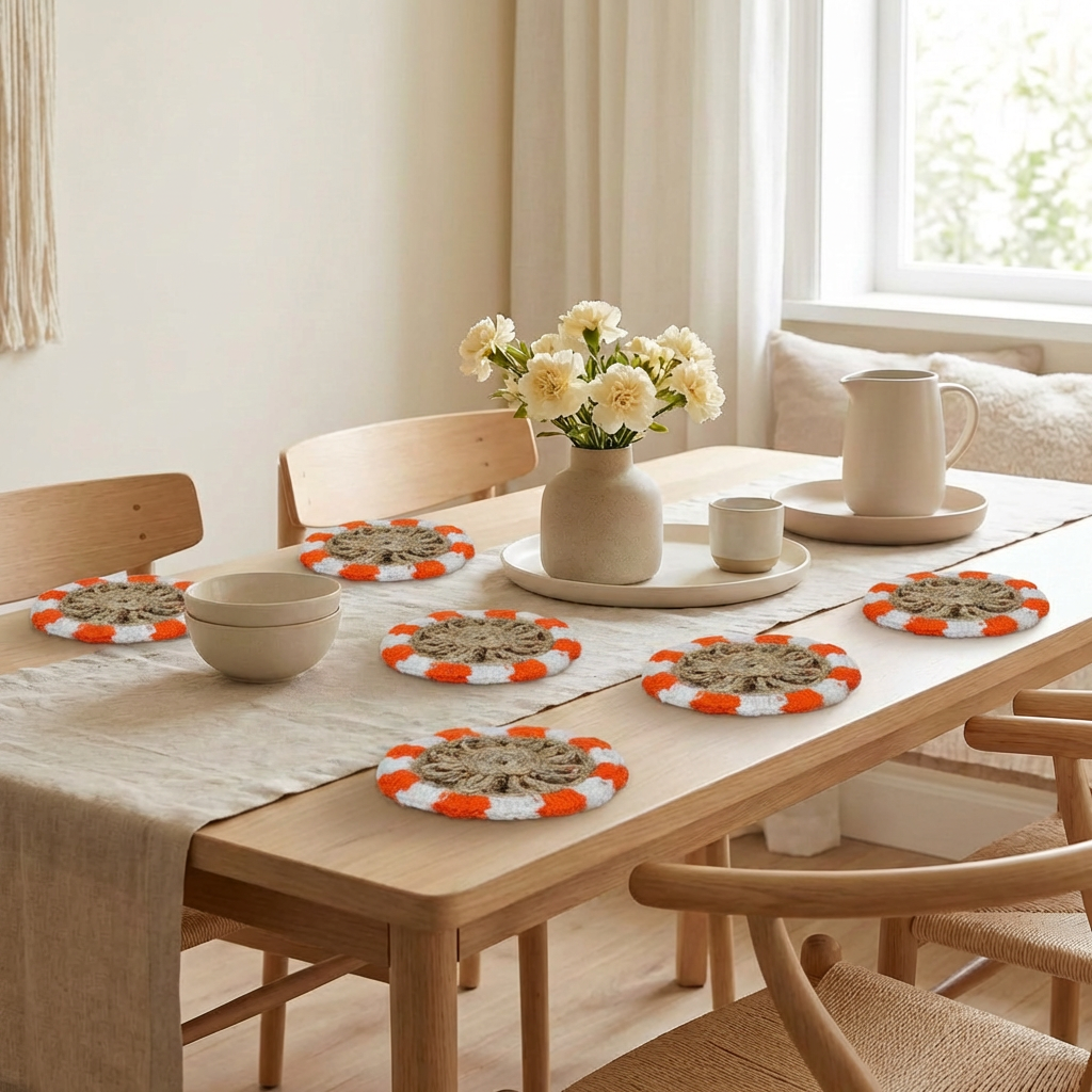 The artisans behind these coasters come from a tradition of jute work that has been alive in Madhya Pradesh for generations. Each coaster begins at the centre, where natural jute is looped and braided outward in an open, lace-like pattern. The orange and white woollen border is then crocheted around the edge in alternating segments, giving the finished piece the look of a small, handmade mandala. No two sets are entirely identical, which is precisely what makes them special.