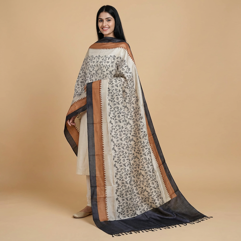 Handwoven Tussar Silk Dupatta | Beige & Black Handwoven Tussar Silk Dupatta | Beige & Black Handwoven Tussar Silk Dupatta | Beige & Black Handwoven Tussar Silk Dupatta | Beige & Black