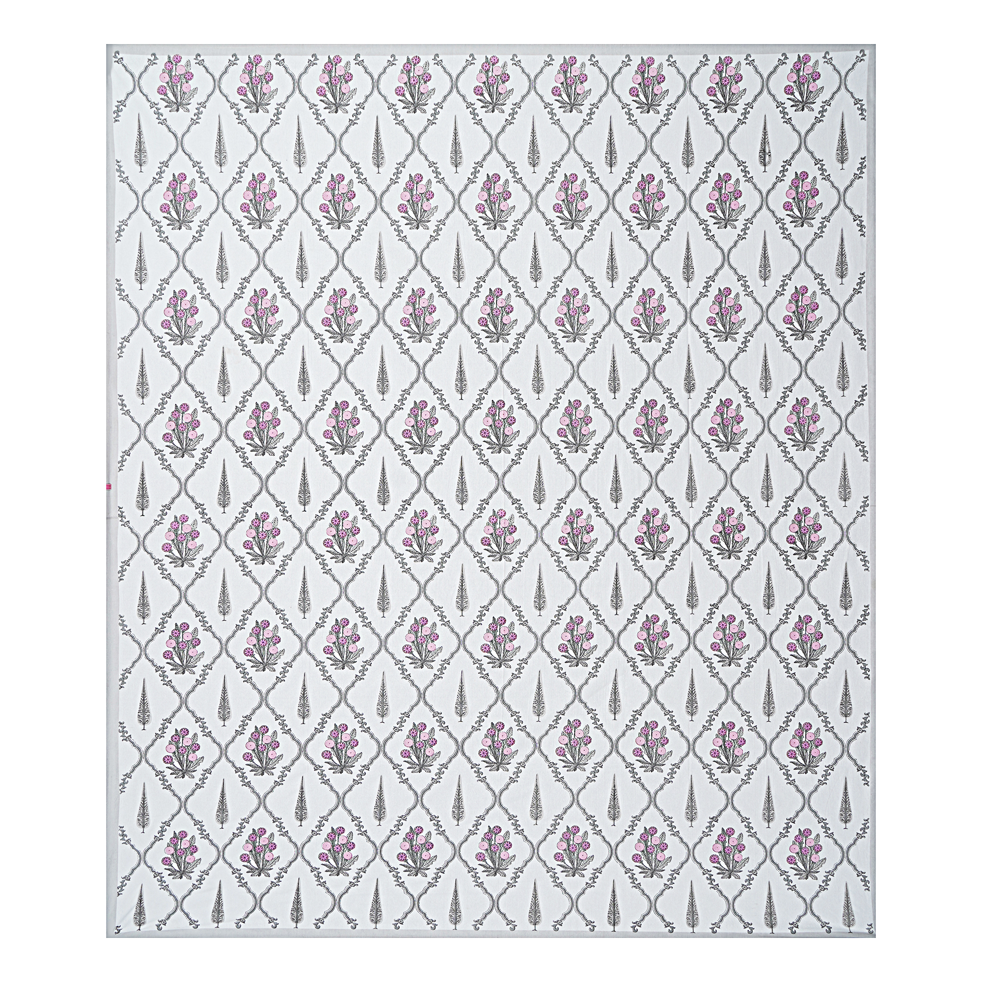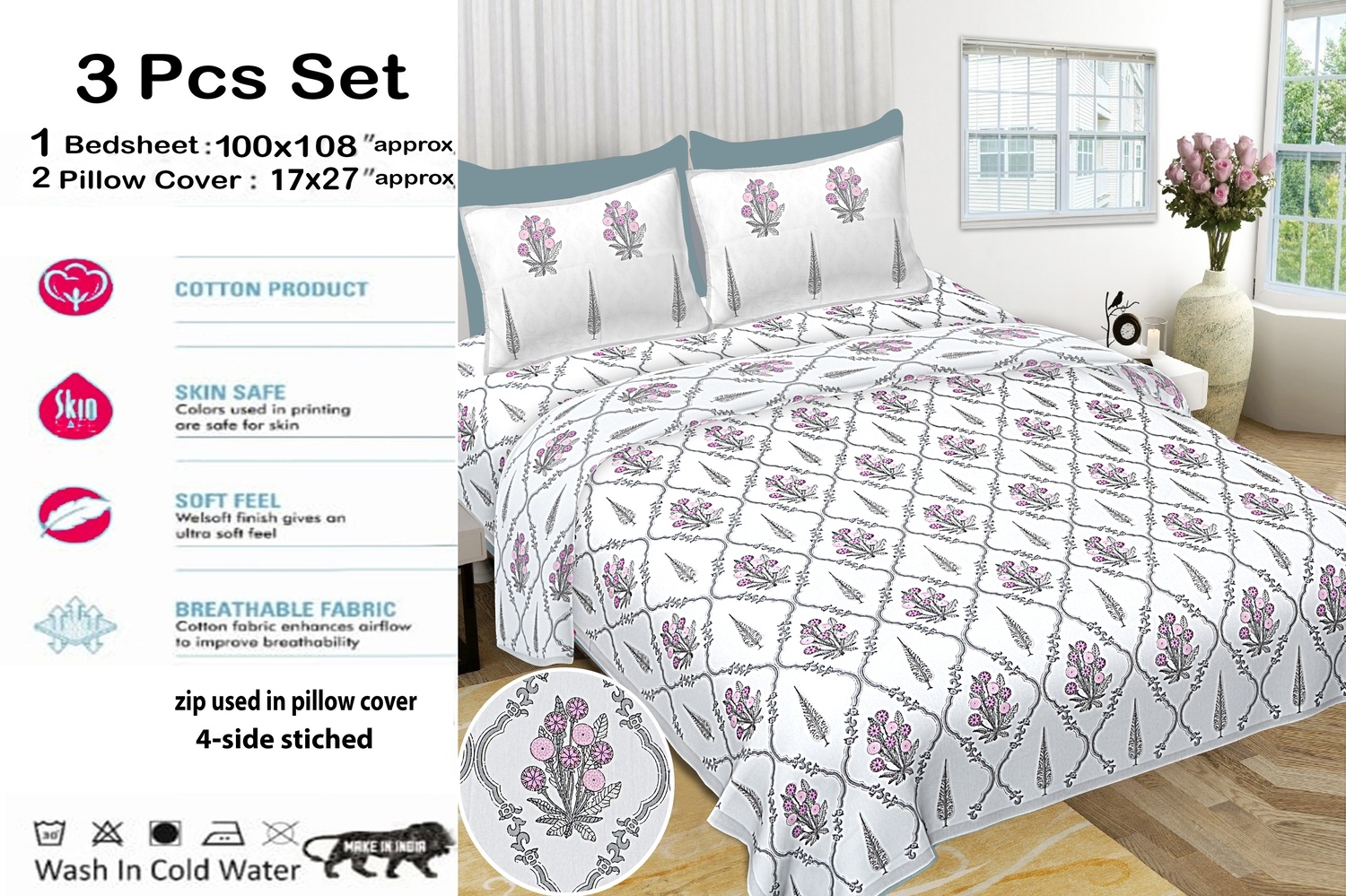Designed from high-grade cotton, the double king-size bedsheet (90x108 inches) feels soft and is ideal for all seasons. The pink and white colour palette brightens up any room. Matching pillow covers (27x17 inches) are sewn with secure zippers, adding finesse to both design and function.