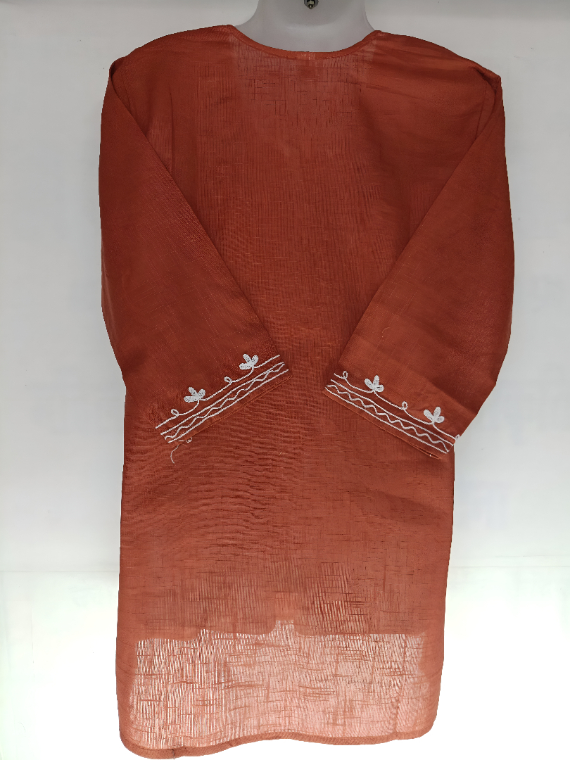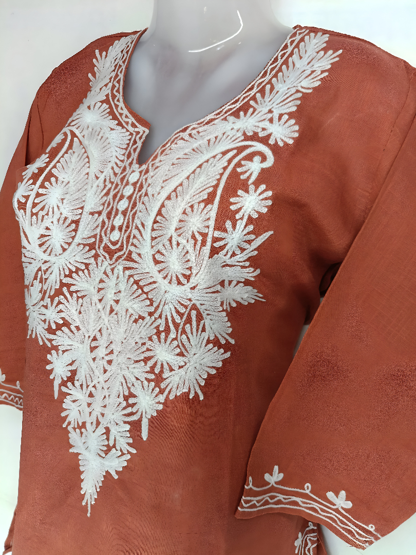 Elegant rust orange cotton kurti featuring intricate white Chikankari-style embroidery, 3/4 sleeves, and a comfortable, breathable fit—perfect for everyday or semi-formal wear.