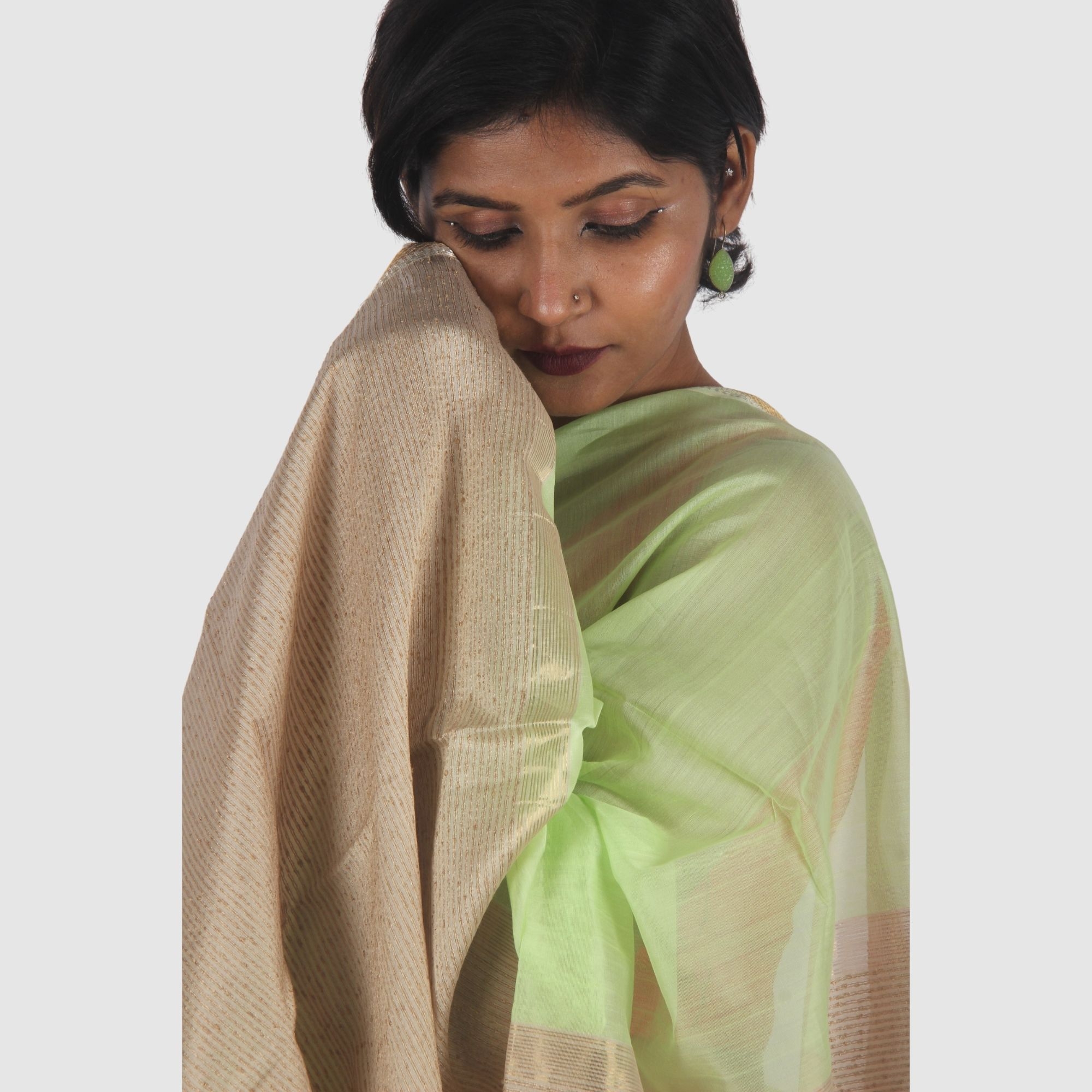 This graceful pastel green Maheshwari saree is enhanced with a subtle gold zari border and a shimmering gold zari pallu, reflecting the exquisite craftsmanship of Maheshwar handloom tradition. Its soft pastel shade gives a sophisticated and elegant appearance suitable for both festive and casual occasions.