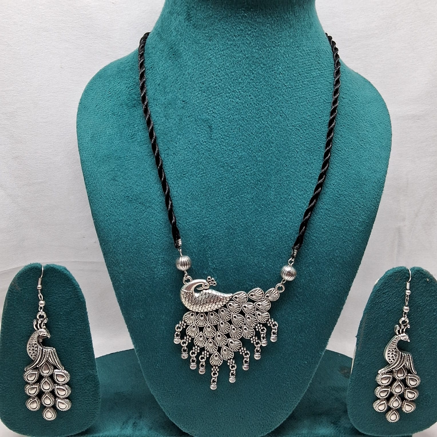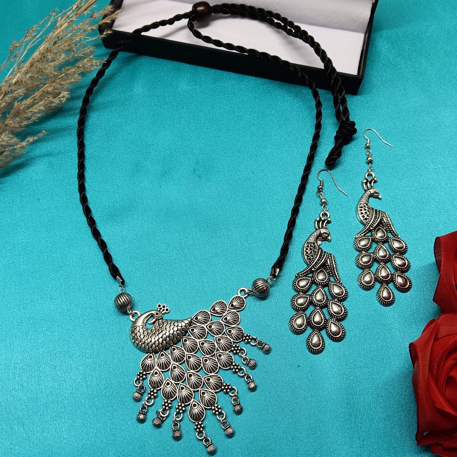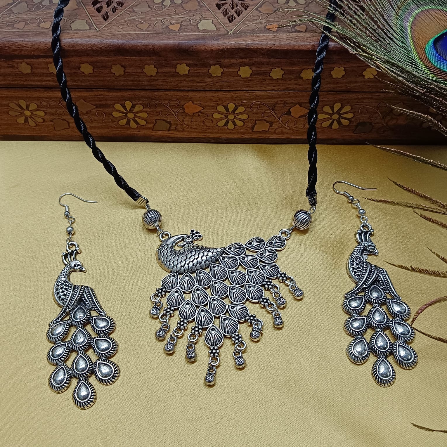 This elegant oxidized silver jewelry set features a detailed peacock motif, symbolizing beauty and grace. The set includes a statement necklace with a prominent peacock pendant and matching earrings that mirror the design.