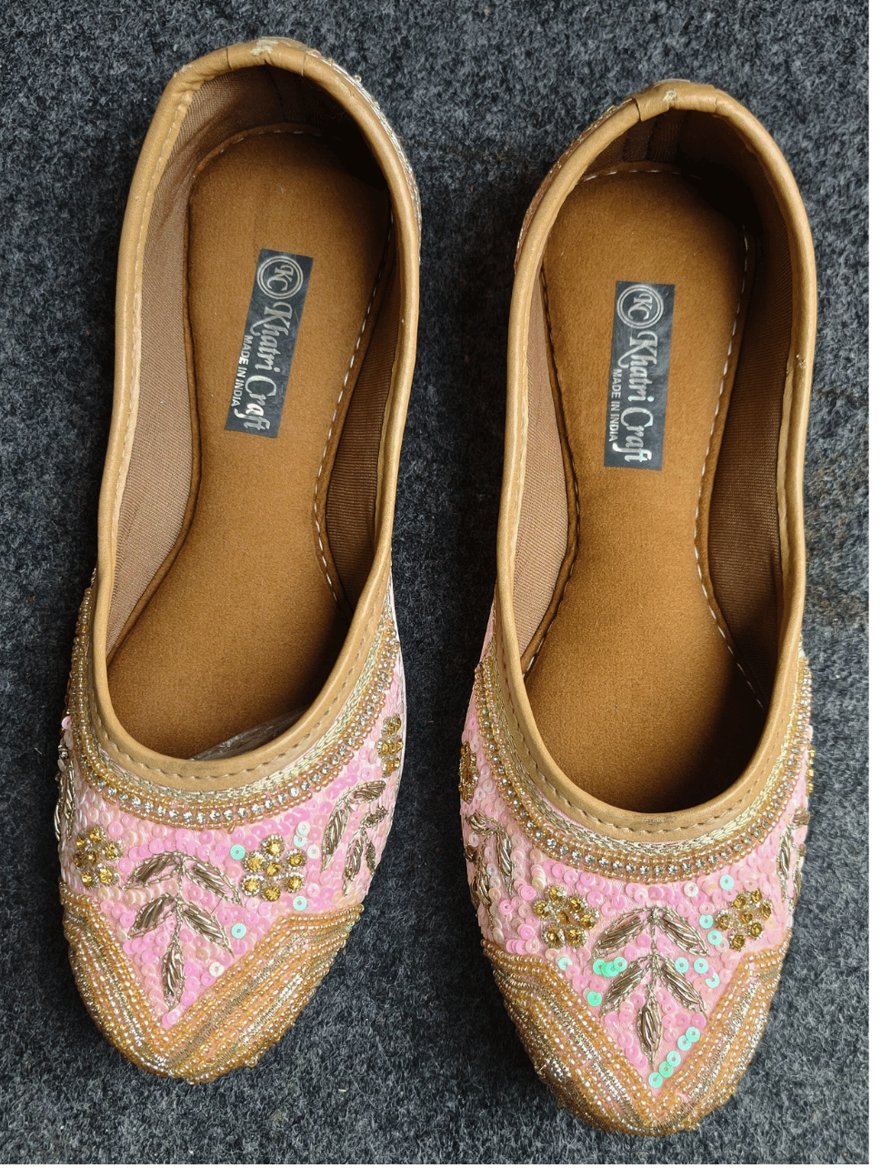 Zardozi embroidery traces its origins to royal workshops that flourished under Mughal and regional patronage. Punjab became one of the prominent centers where artisans perfected the art of metallic thread embroidery on textiles. Traditionally, Zardozi work was reserved for special garments and accessories meant for significant occasions. Juttis embellished with Zardozi symbolized elegance, prosperity, and cultural pride. This pink jutti reflects that heritage, blending festive charm with time-honored craftsmanship.