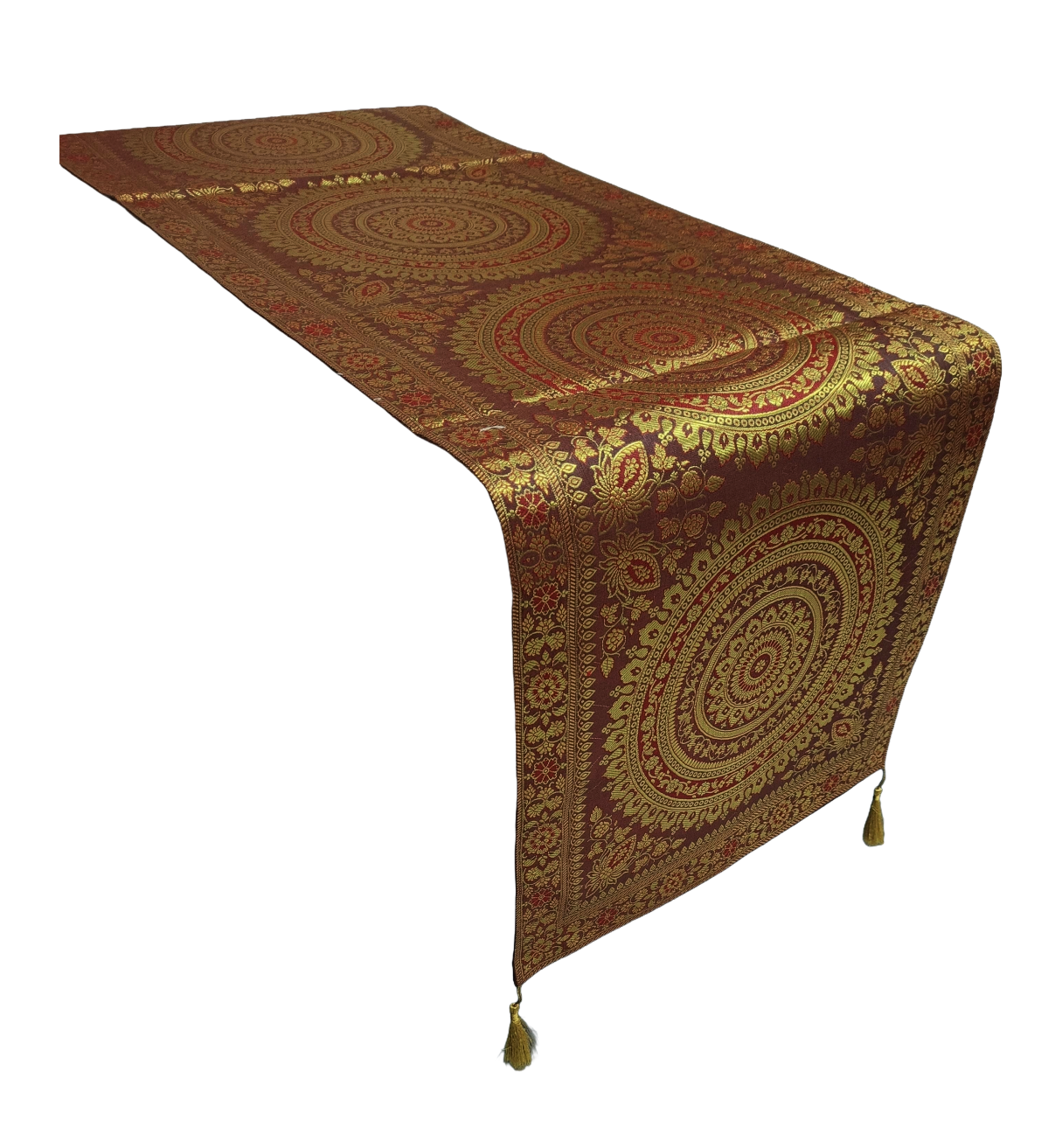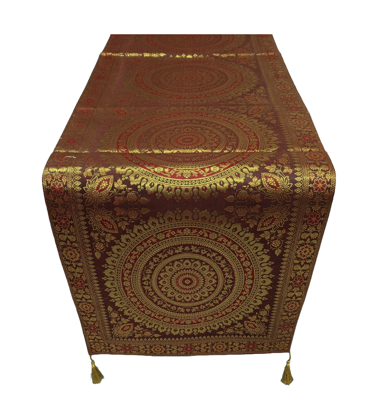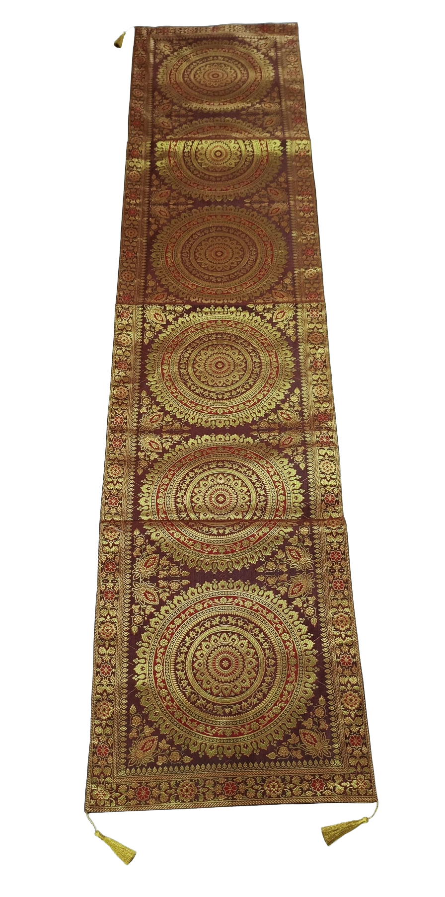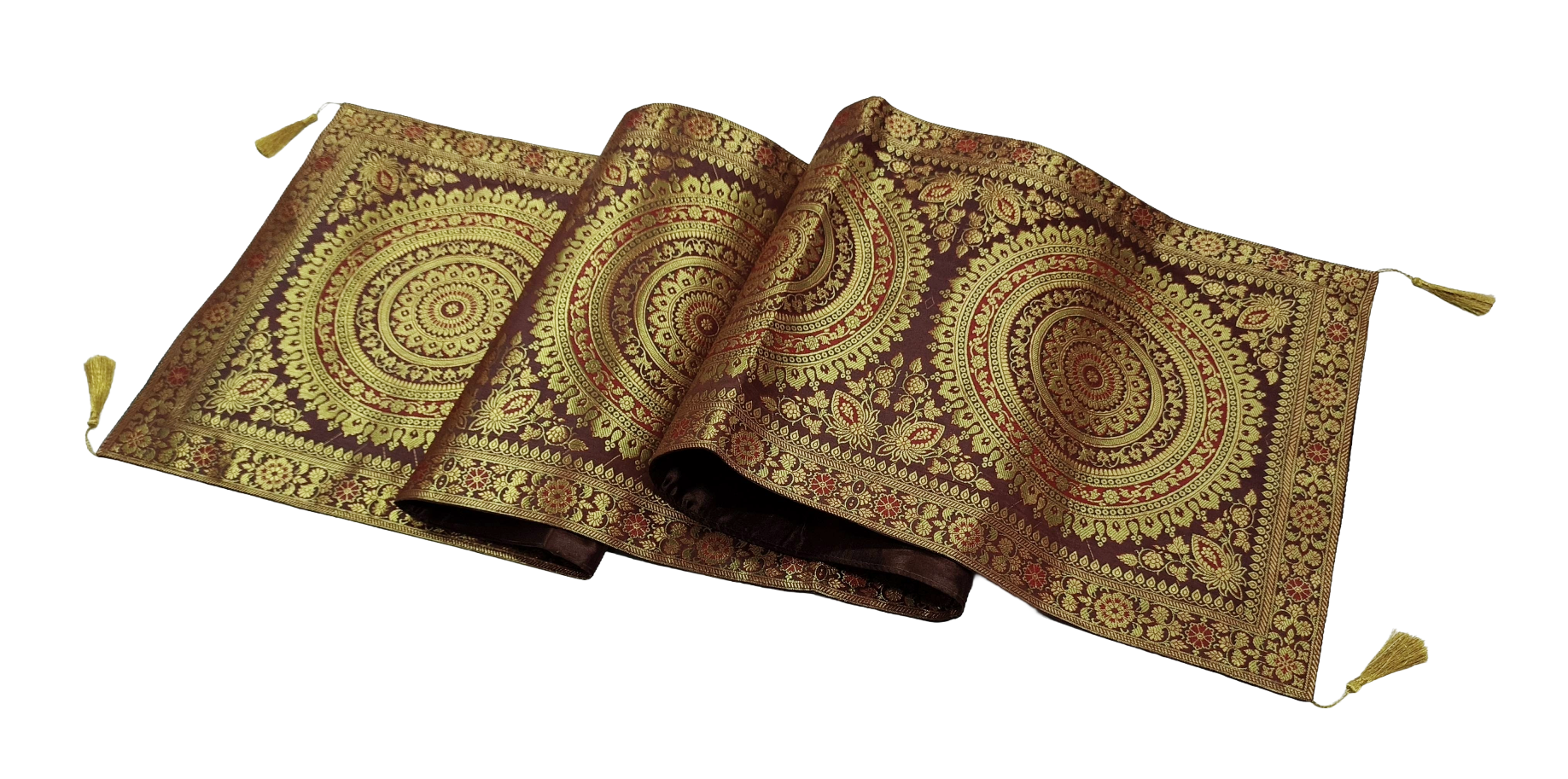 Premium Banarasi Brocade Silk Table Runner -Ethnic Mandala Design 16 x 72 inches - 6 Ft Long - Coffee Brown