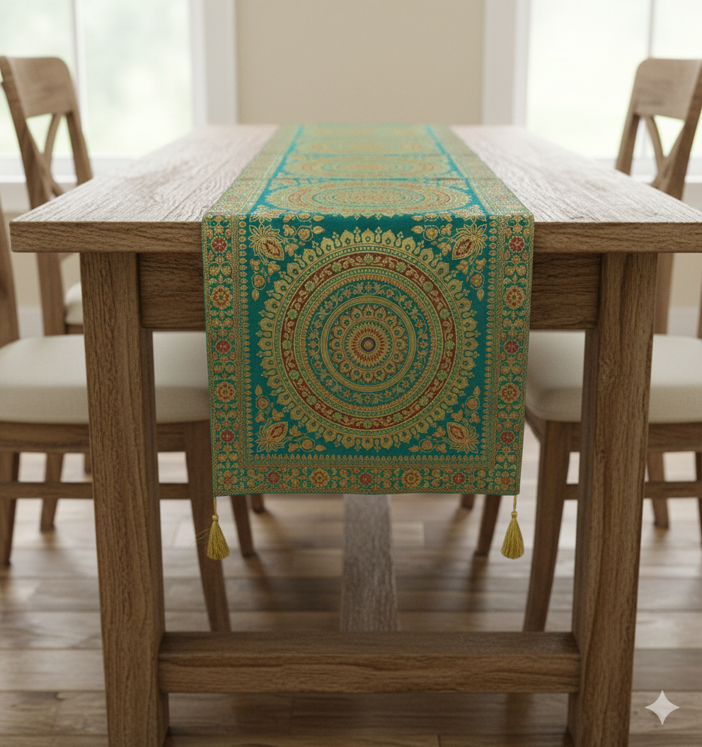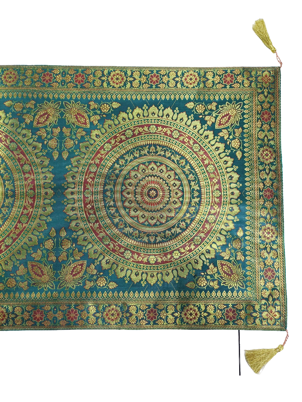 Premium Banarasi Brocade Silk Table Runner -Ethnic Mandala Design 16 x 72 inches - 6 Ft Long- Emerald Green