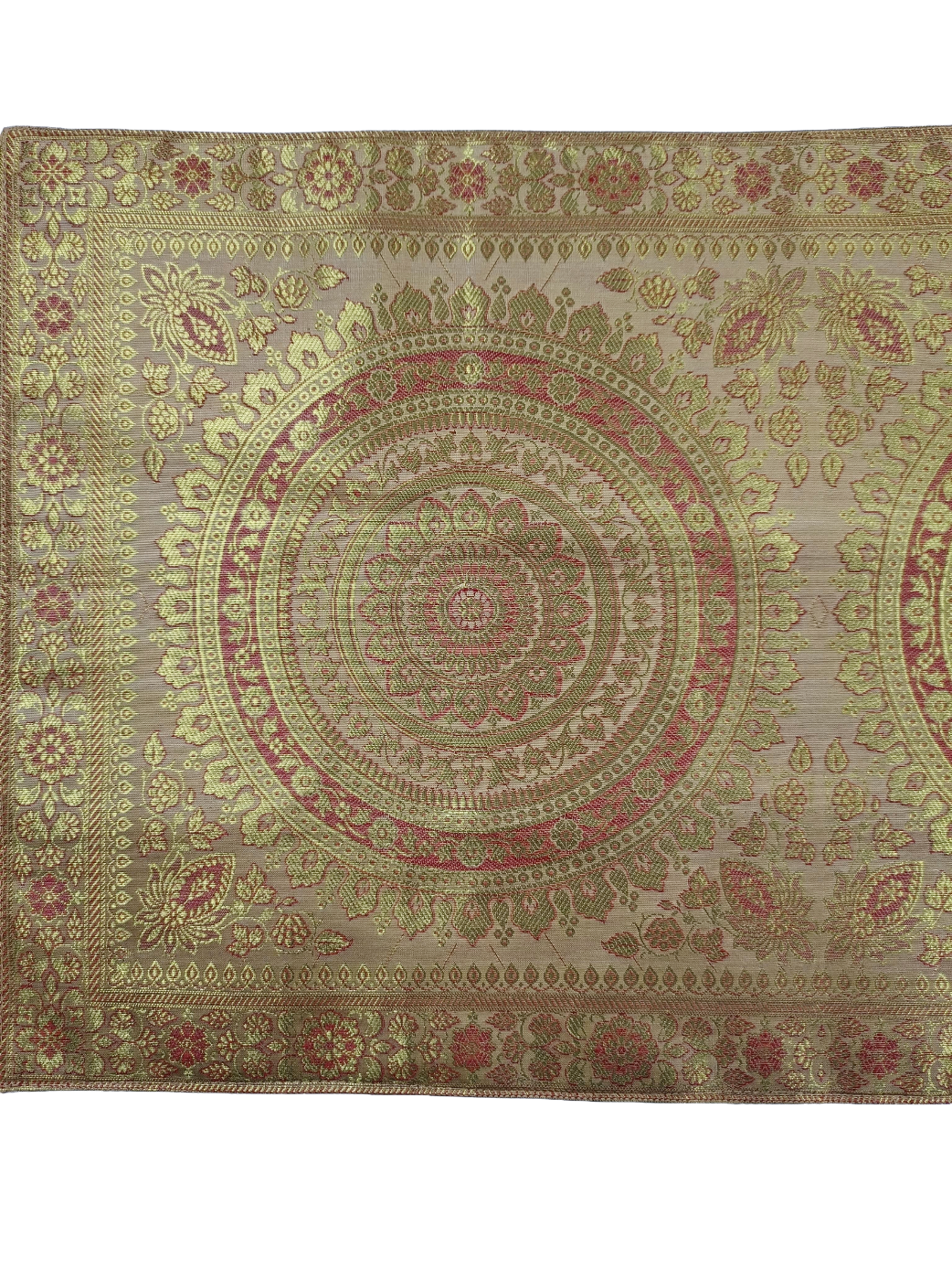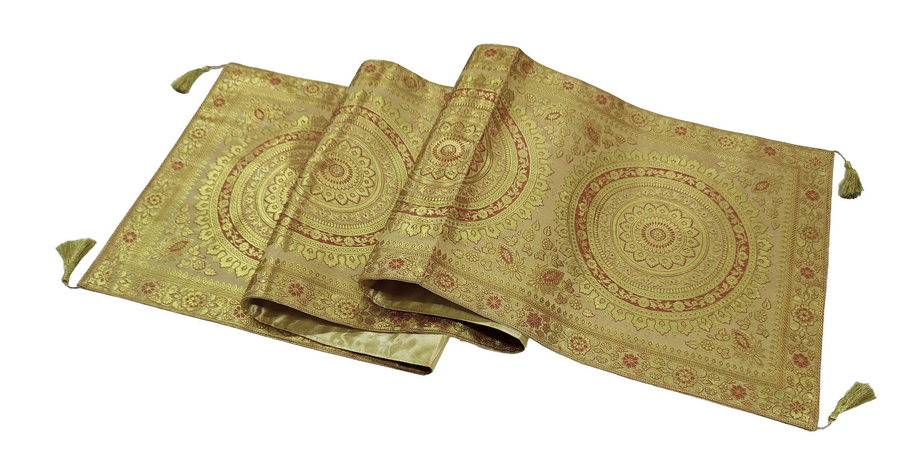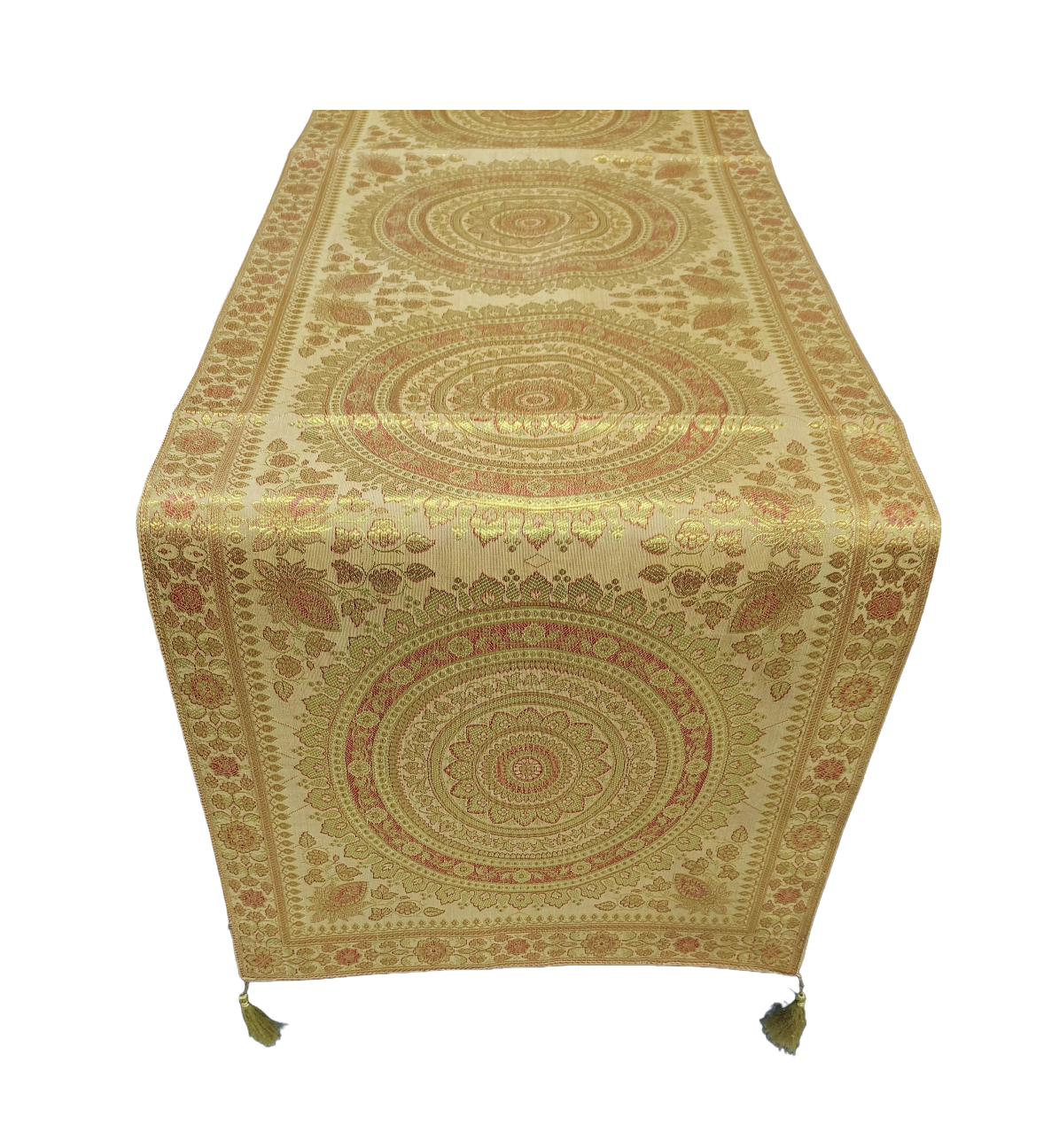 Premium Banarasi Brocade Silk Table Runner -Ethnic Mandala Design 16 x 72 inches - 6 Ft Long, Beige Golden