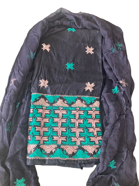 This handcrafted Punjabi Phulkari suit embodies tradition and style. Made from soft, breathable cotton (top and bottom), it features a stunning half-pure hand-embroidered dupatta (2.10 meters) that adds a touch of elegance to your ethnic look. The suit (top—2.40 meters, bottom—2.50 meters) comes unstitched, allowing for a perfect custom fit up to XXXL.