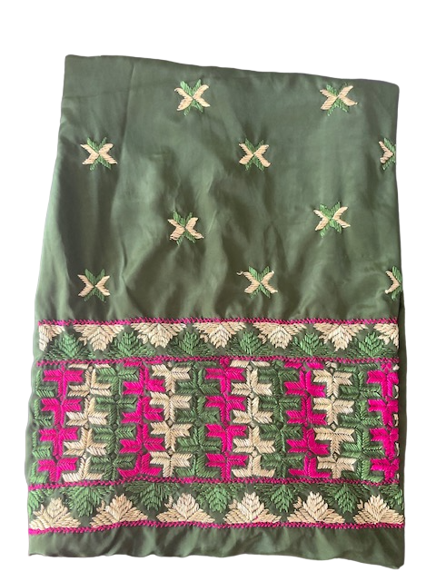 The Traditional Hand-Embroidered Punjabi Suit in green is a fine example of Punjabi craftsmanship, showcasing intricate hand embroidery on silk fabric for the top and half-pure hand-embroidered dupatta. The combination of silk and silk cotton fabrics ensures both comfort and style, making it an ideal choice for weddings and ceremonies.