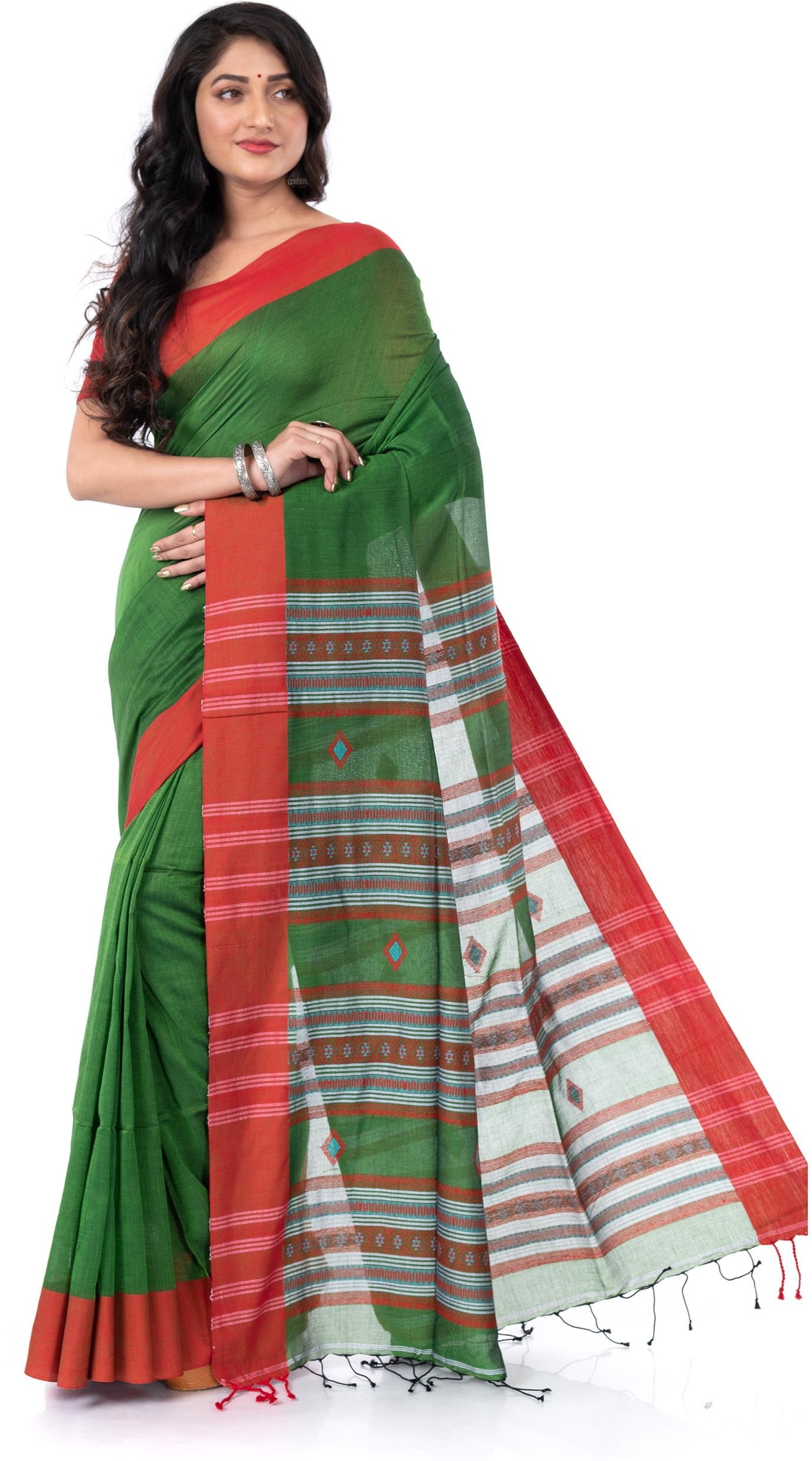 Handloom Pure Cotton Santipur Saree Online | Green & Red