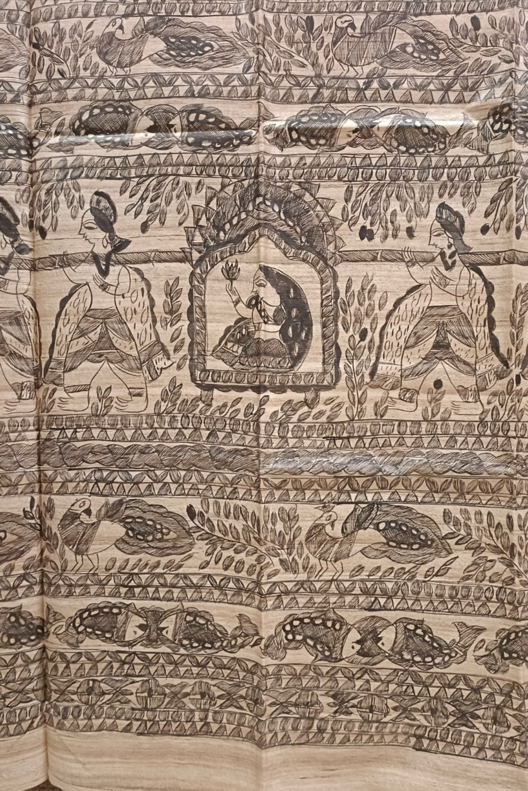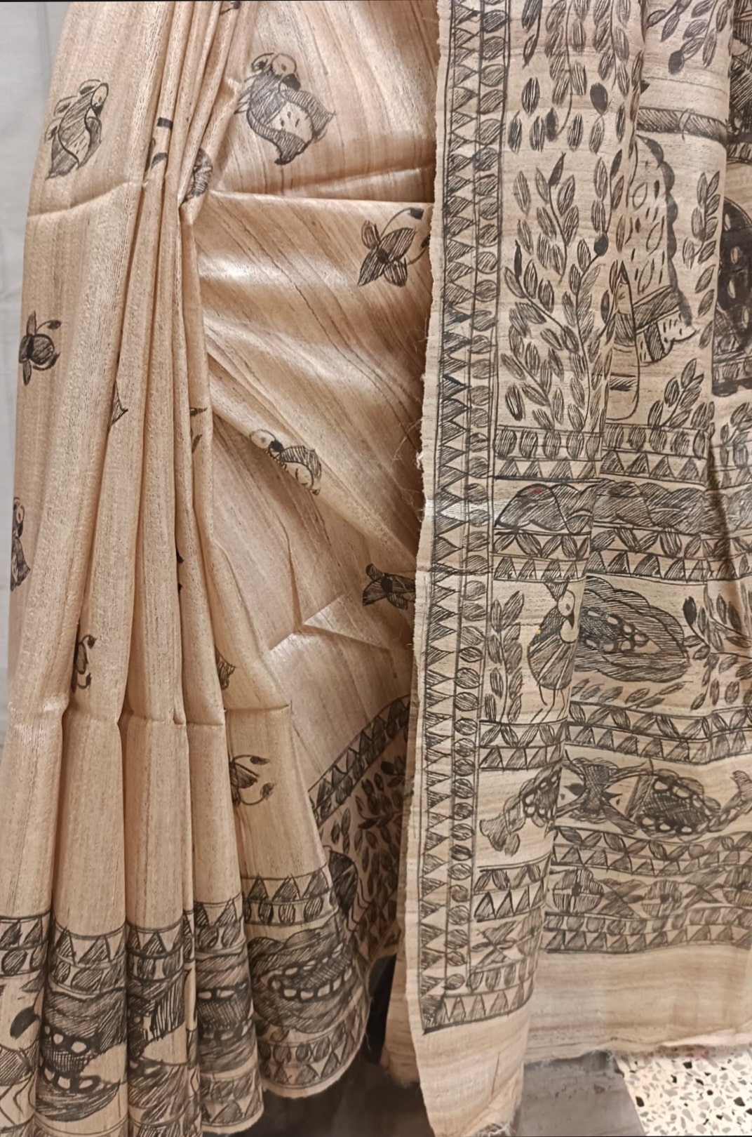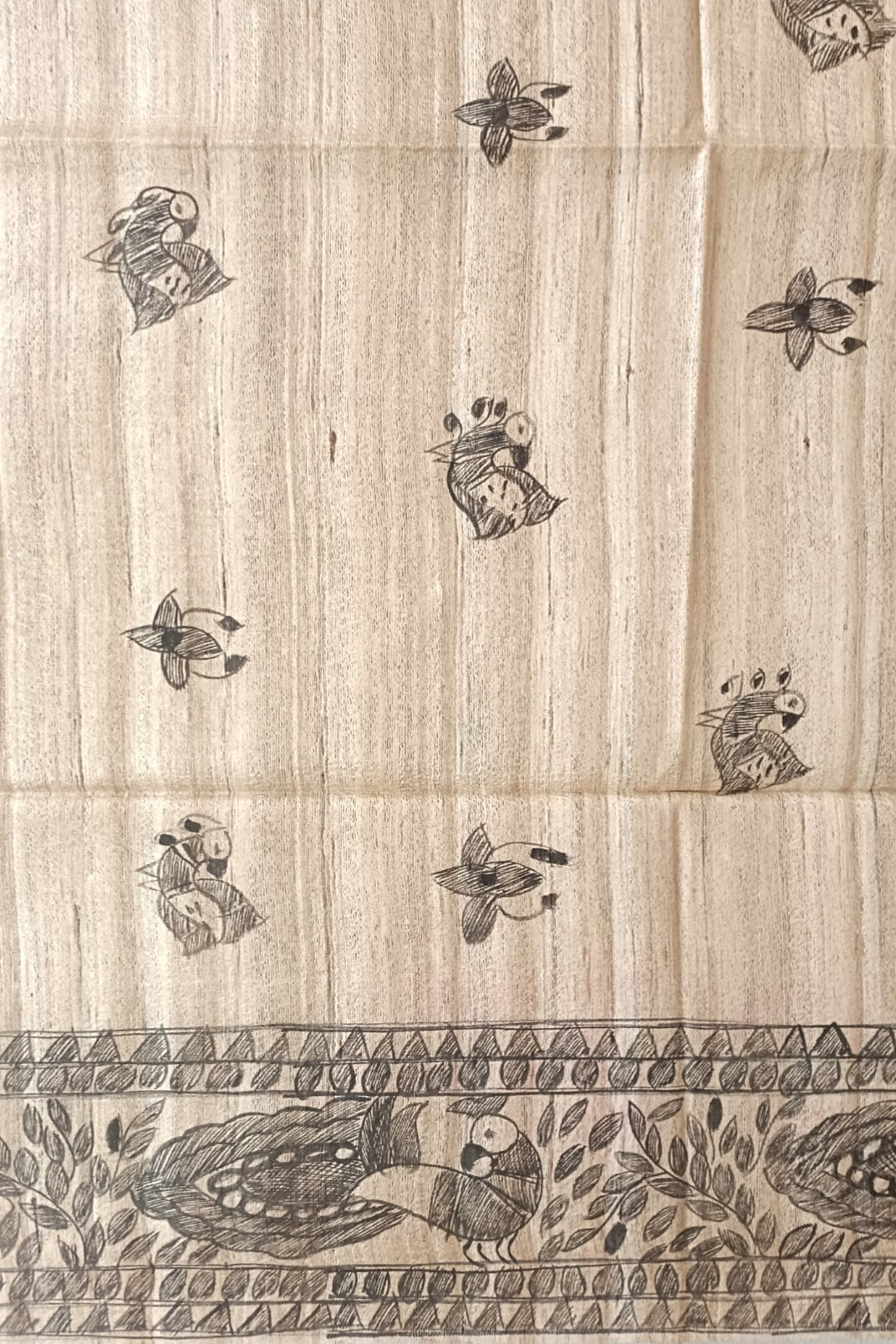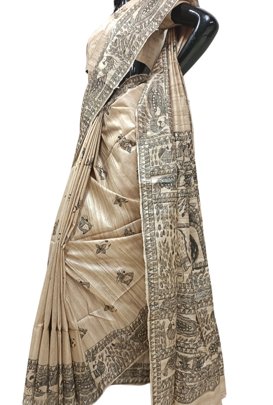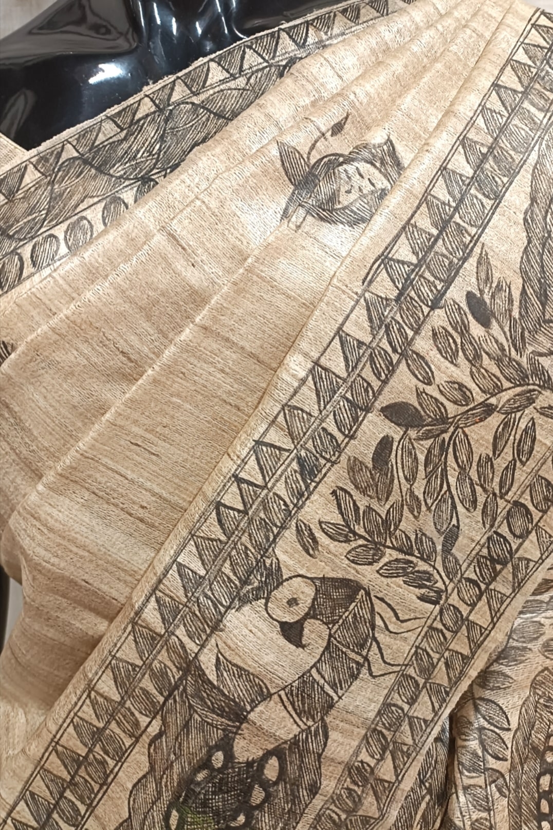 Pure Tussar Ghicha Silk Saree with Madhubani Hand Painting & Running Blouse - Natural Handloom Weave