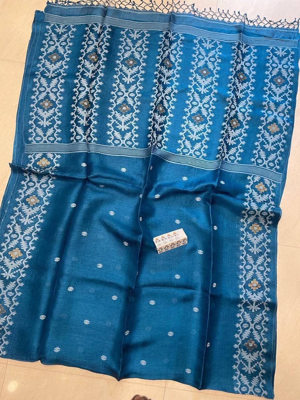 Tussar saree is made by fine count embellished by extra warp designs with multi coloured yarns. It is a simple formation of tussar saree & woven with figured motifs, in transparent plain ground, with designs of extra warp in borders and extra weft in the body.