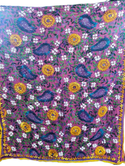 Phulkari (Punjabi: ਫੁਲਕਾਰੀ) refers to the folk embroidery of the Punjab. Although Phulkari means floral work, the designs include not only flowers but also cover motifs and geometrical shapes.The main characteristics of Phulkari embroidery are use of darn stitch on the wrong side of coarse cotton cloth with coloured silken thread. Punjabi women create innumerable alluring and interesting designs and patterns by their skilful manipulation of the darn stitch