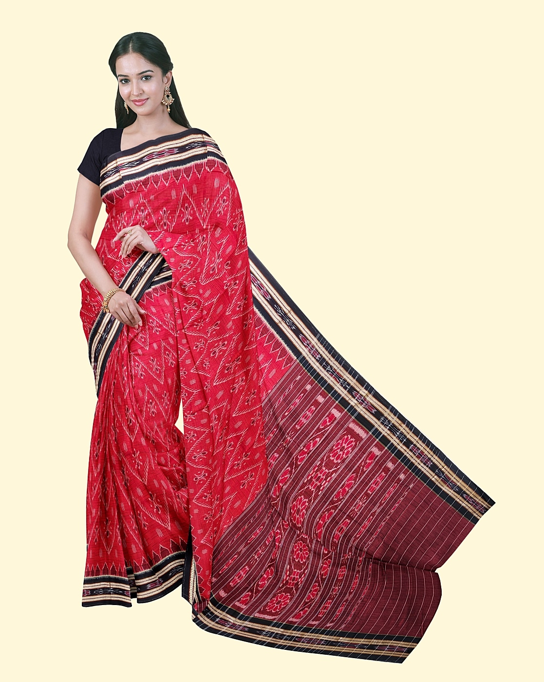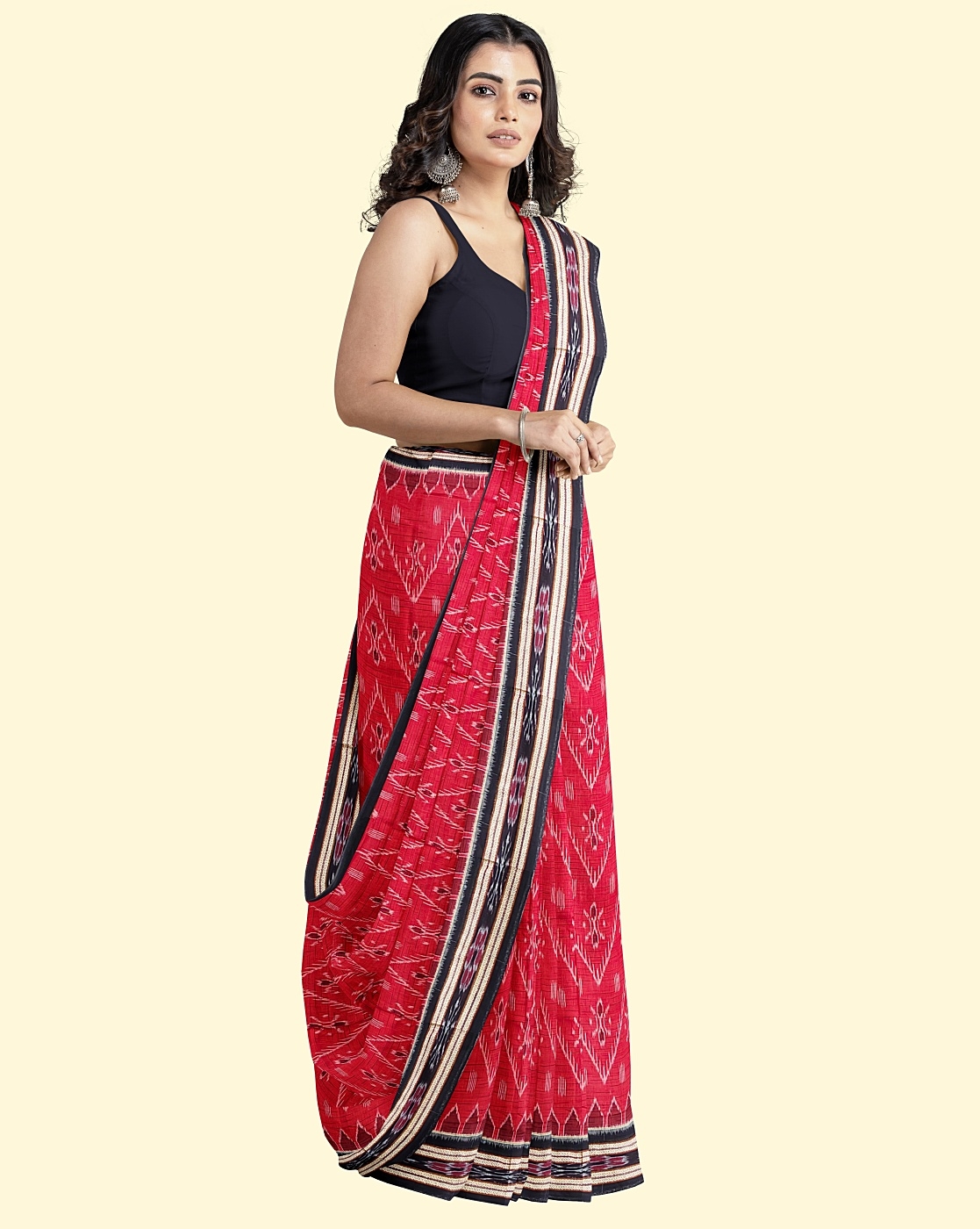Red Black Sambalpuri Handwoven Single Ikat Cotton Saree SFCSARAJ79