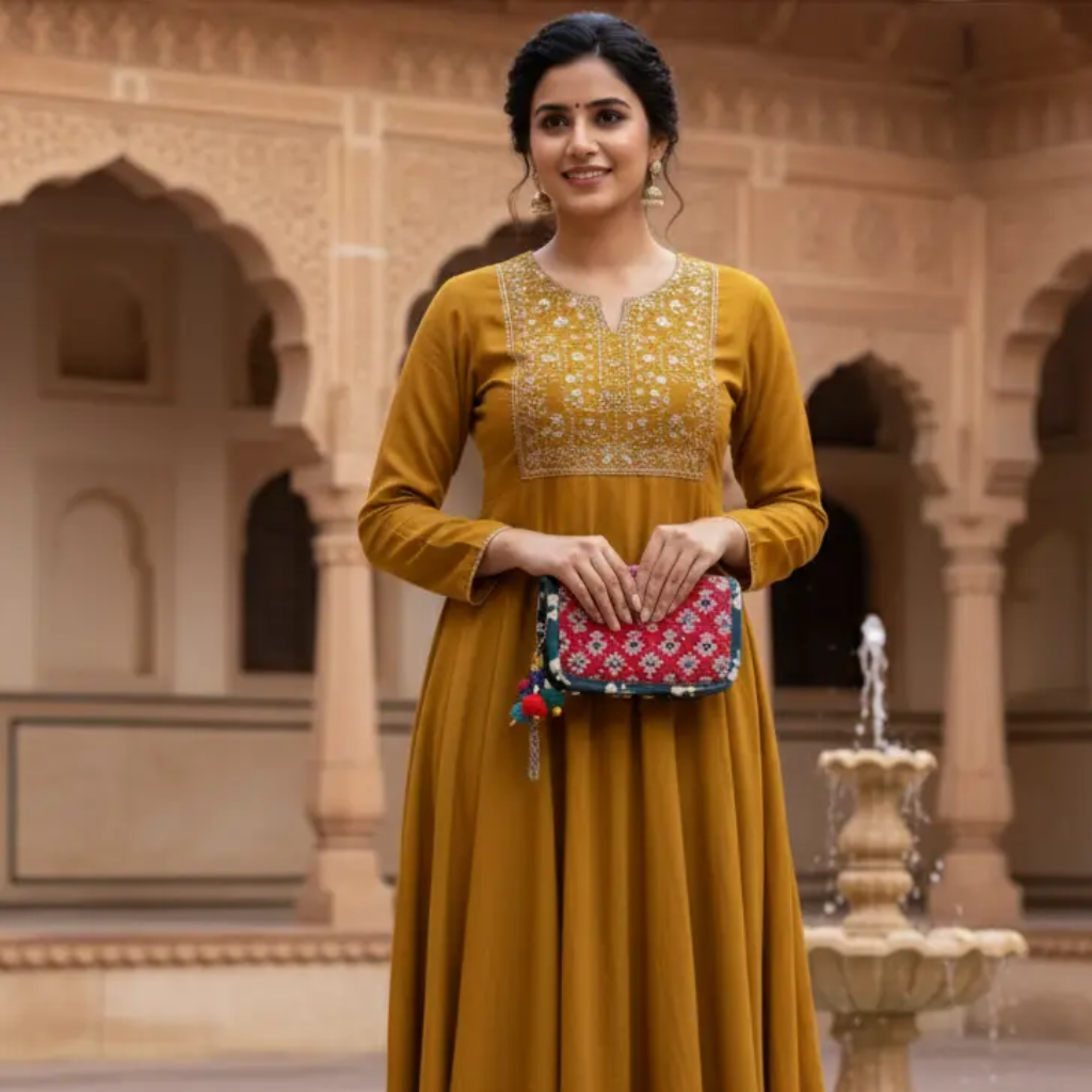 This red ethnic motif printed clutch adds a vibrant touch to any casual outfit. The lightweight structure and compact size make it perfect for storing essentials like cash, cards, keys, lip balm, and small accessories. The white printed motifs create a bold contrast against the red base, giving it a stylish and eye-catching look. Suitable for casual outings, errands, college days, or gifting, this clutch fits easily inside larger bags or can be carried on its own.