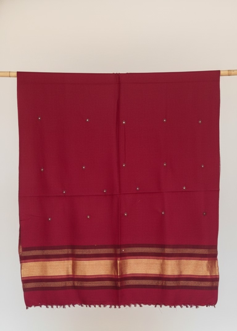 This red shawl features elegant golden zari detailing complemented by fine handwork, creating a rich and graceful look. Crafted with care, it offers warmth along with visual appeal. The deep red tone enhances the intricate embellishments, making it ideal for festive occasions, ceremonies, or refined ethnic styling.