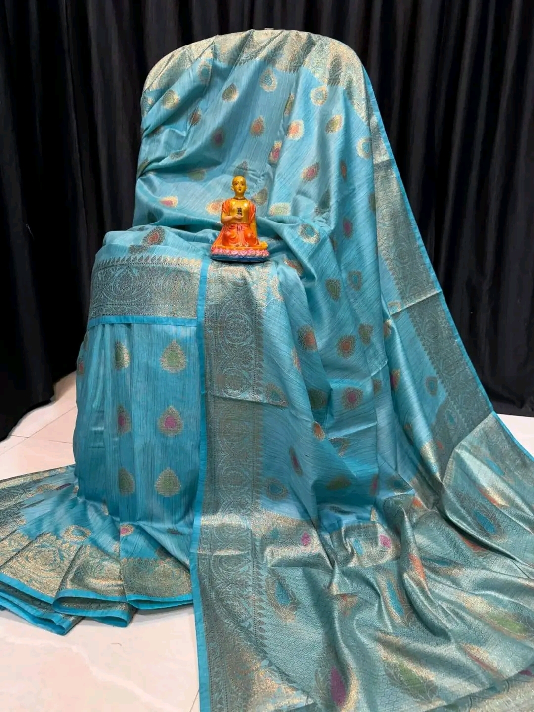 Bring timeless elegance to your wardrobe with this Pure Tussar Mungaa Silk Banarasi Saree, crafted with luxurious silk yarns and adorned with golden zari jaikart weaving work. The saree features beautifully detailed borders and woven butaa motifs, making it a perfect choice for weddings, festive occasions, and grand celebrations.