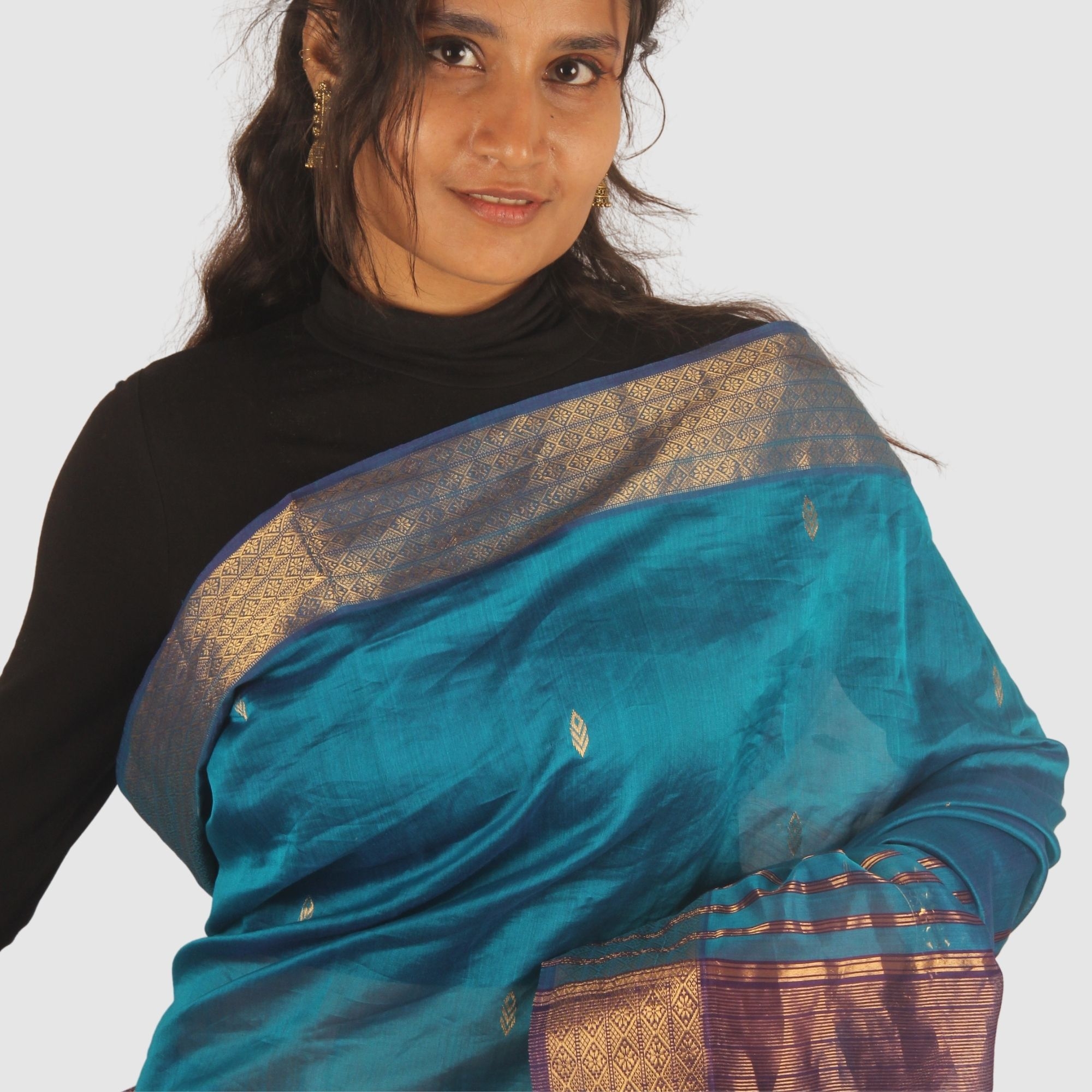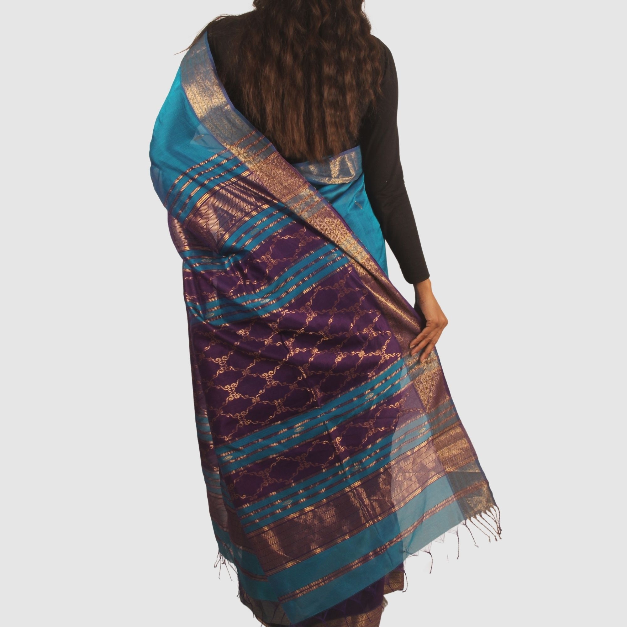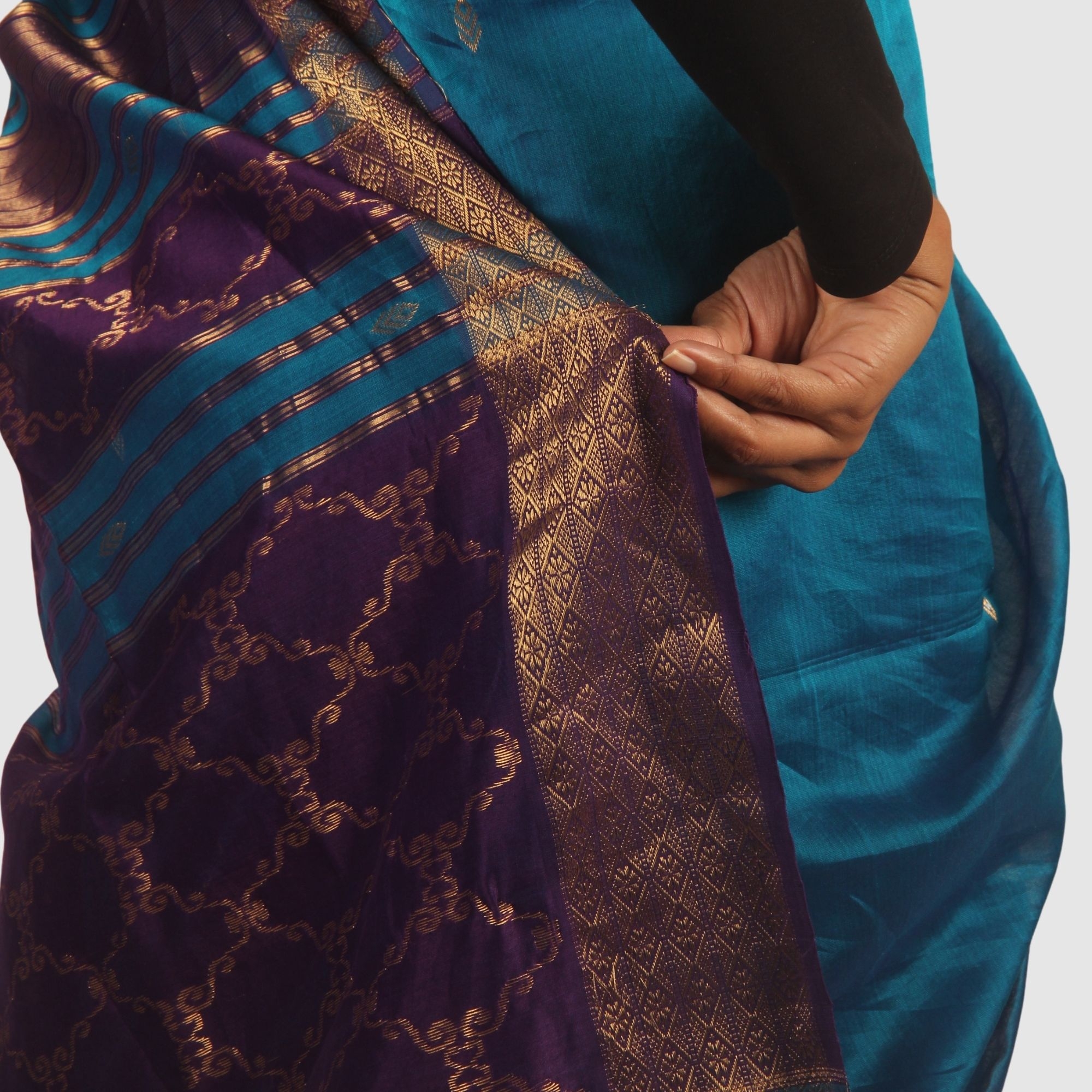 Regal Teal Maheshwari Silk Cotton Handloom Saree with Royal Purple Pallu and Gold Zari