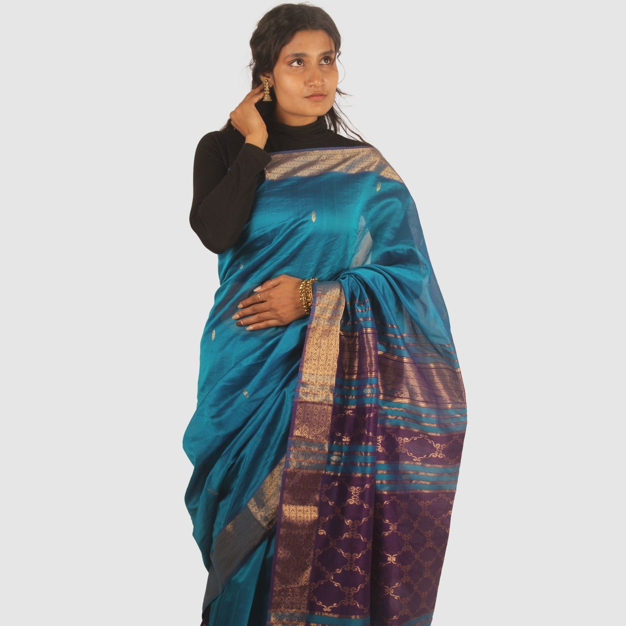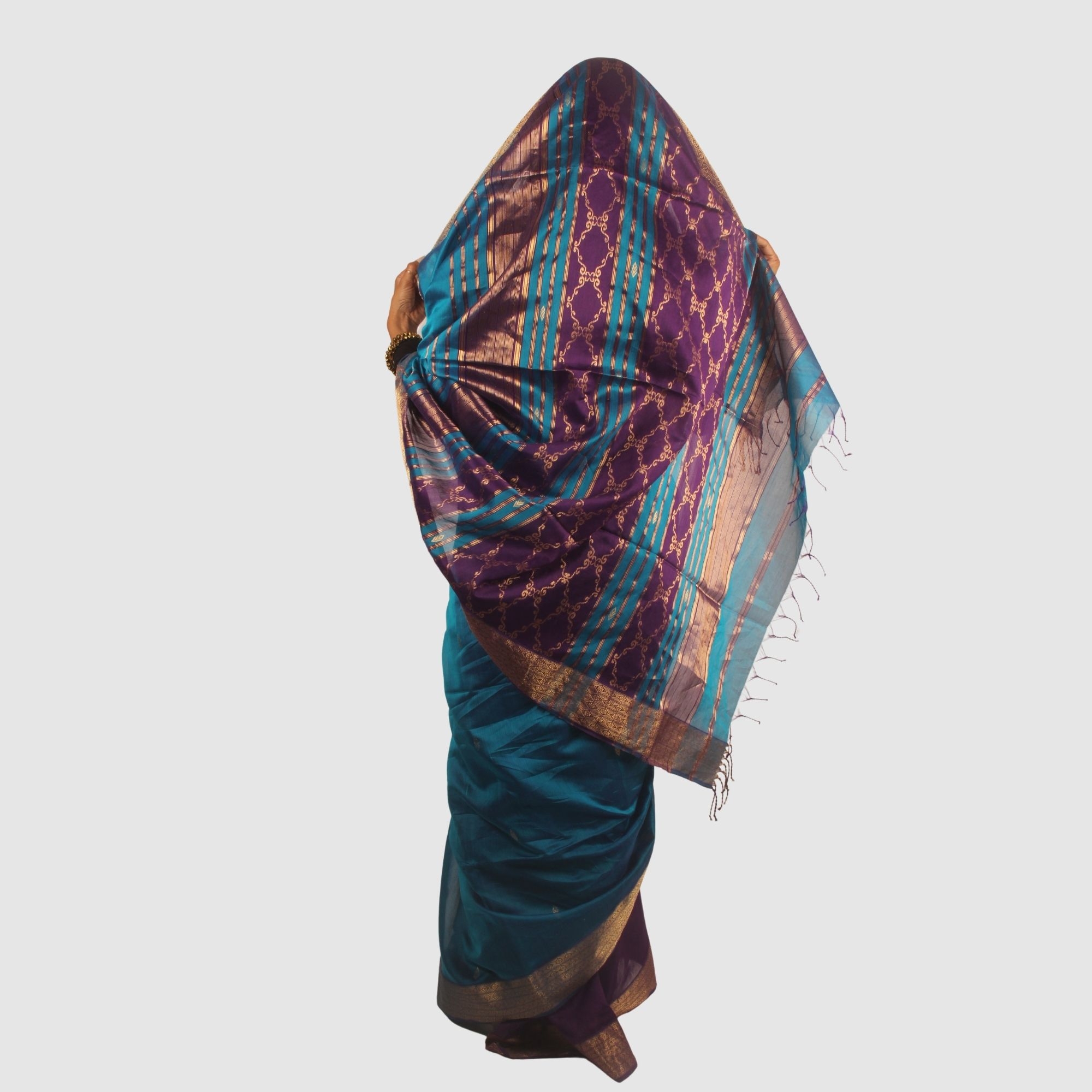 This graceful teal blue Maheshwari handloom saree is beautifully complemented by a royal purple pallu and enhanced with rich gold zari detailing. The striking contrast of teal and purple creates a regal statement while preserving timeless traditional elegance.