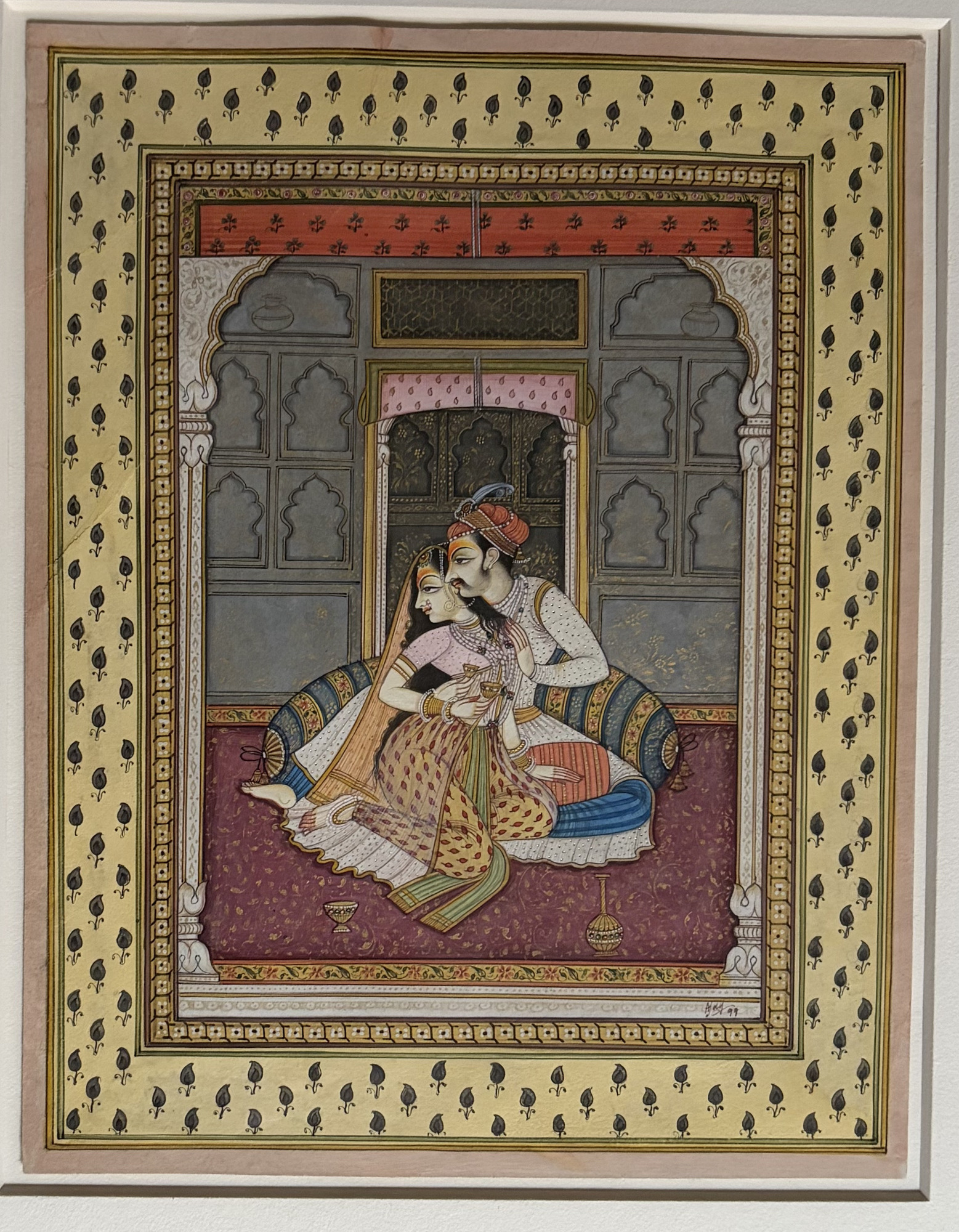 Romantic Moments is an original hand painted Indian miniature artwork created by National Award recipient Ajay Kumar Garg. This painting captures an intimate royal couple seated within a traditional palace setting, reflecting classical Rajput miniature style and the elegance of Indian court life.