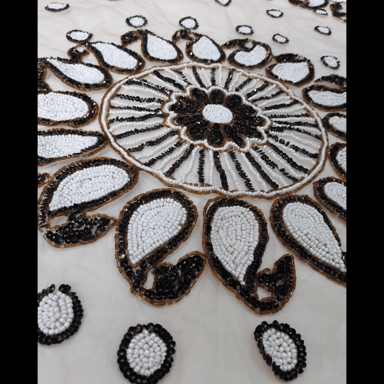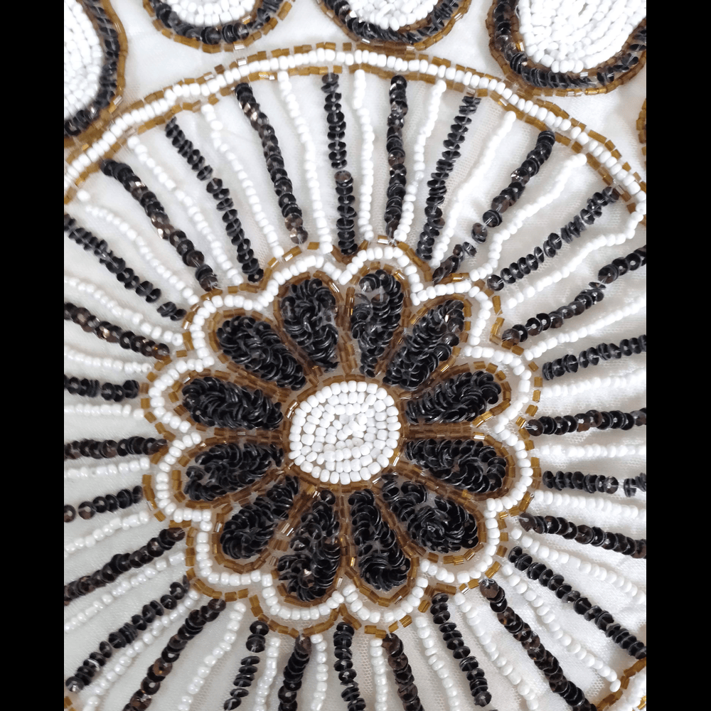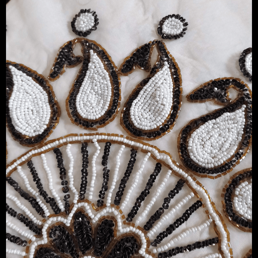 This beautiful handcrafted fabric features an intricate beaded embroidery design, showcasing elegant paisley motifs encircling a central floral pattern. The combination of black, white, and golden beads adds a rich and traditional touch to the white fabric base. Perfect for ethnic garments, saree blouses, kurtis, or home décor accents like cushion covers or table runners, this piece reflects skilled craftsmanship and timeless elegance. Ideal for festive occasions or special events, it brings grace and charm to any look or space.