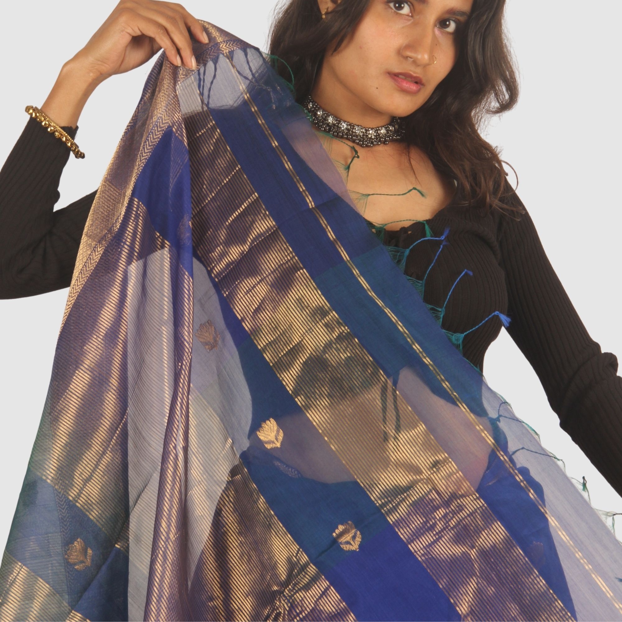 This rich royal blue Maheshwari silk cotton saree beautifully showcases traditional craftsmanship and timeless elegance. Adorned with delicate gold zari motifs and a classic woven border, it exudes sophistication and festive charm.