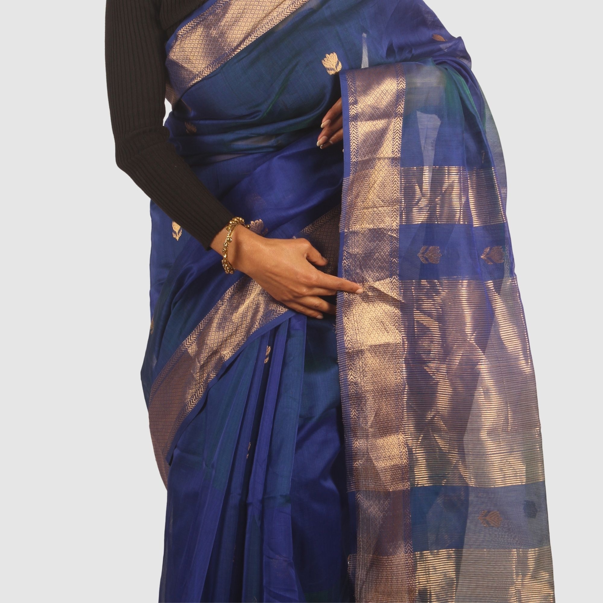 Royal Blue Maheshwari Silk Cotton Saree with Gold Zari Border