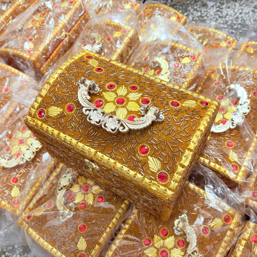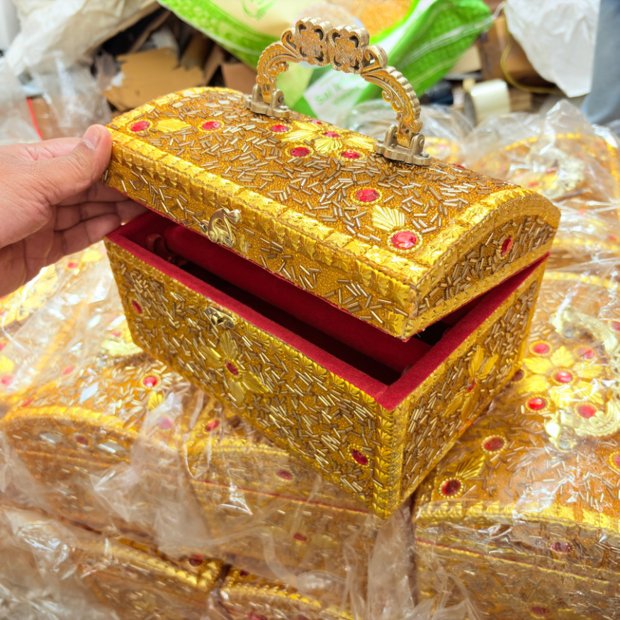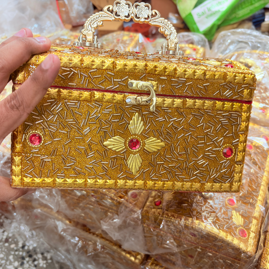 Handcrafted golden vanity box designed for safe and stylish storage of bangles, jewelry, and accessories. Features a durable build with fine finishing and a velvet-lined interior for protection. Ideal for weddings, festive gifting, and personal use, this elegant storage box reflects traditional Indian craftsmanship while offering modern utility. 100% handmade in India.