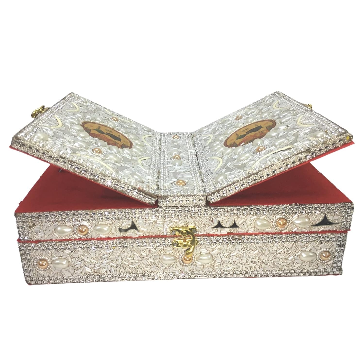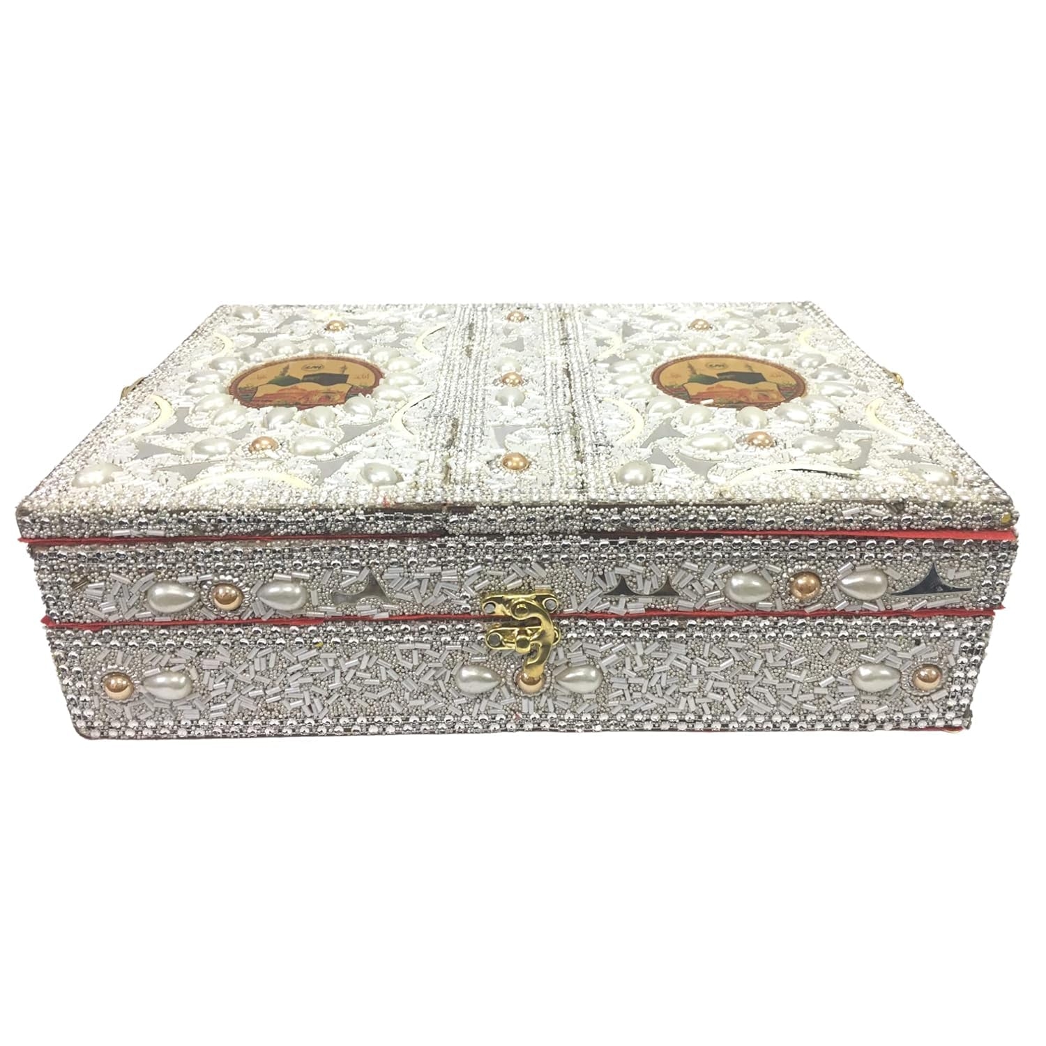 The Santarms Handmade Quran Sharif Box with Rehal Stand is a beautifully crafted wooden masterpiece designed to preserve and honor your holy book with elegance. Adorned with intricate beads work and traditional craftsmanship, this decorative storage case serves as both a Quran box and a foldable Rehal stand for reading during prayers. Its durable wooden build ensures long-lasting use, while the detailed embellishments reflect Islamic artistry and devotion. Perfect as a spiritual gift for brides, weddings, Eid, or Ramadan, this elegant box enhances the serenity of your prayer corner or home décor. The Santarms Quran Box symbolizes reverence, purity, and tradition—making it a meaningful addition to your sacred space or a heartfelt gift for loved ones.