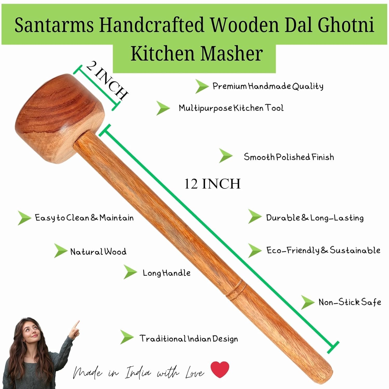 The Santarms Wooden Hand Masher Combo is a traditional kitchen essential crafted from premium natural wood for durability and safe food handling. This set includes a Dal Ghotni and Lassi Maker (Mathani), perfect for mashing, mixing, and churning dals, curd, buttermilk, and batters with ease. Its ergonomic wooden handle offers a comfortable grip, ensuring effortless manual use. Handcrafted for everyday cooking, it brings a touch of Indian tradition and authenticity to your kitchen.