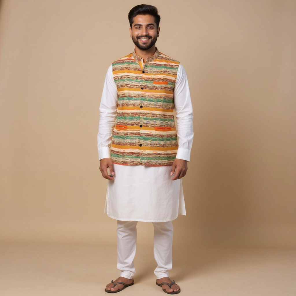 Santiniketan Khesh Jacket is made by 2/17s cotton warp yarn & Weft yarn is made by hand-spinning from rejected cloth materials. Product is 100% cotton which makes jacket comfortable for winters and good in handfeel. Also reminent cotton weft provides unique and embellished look to the jacket
