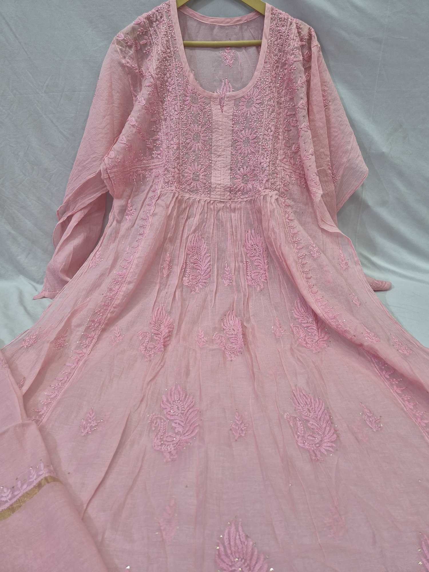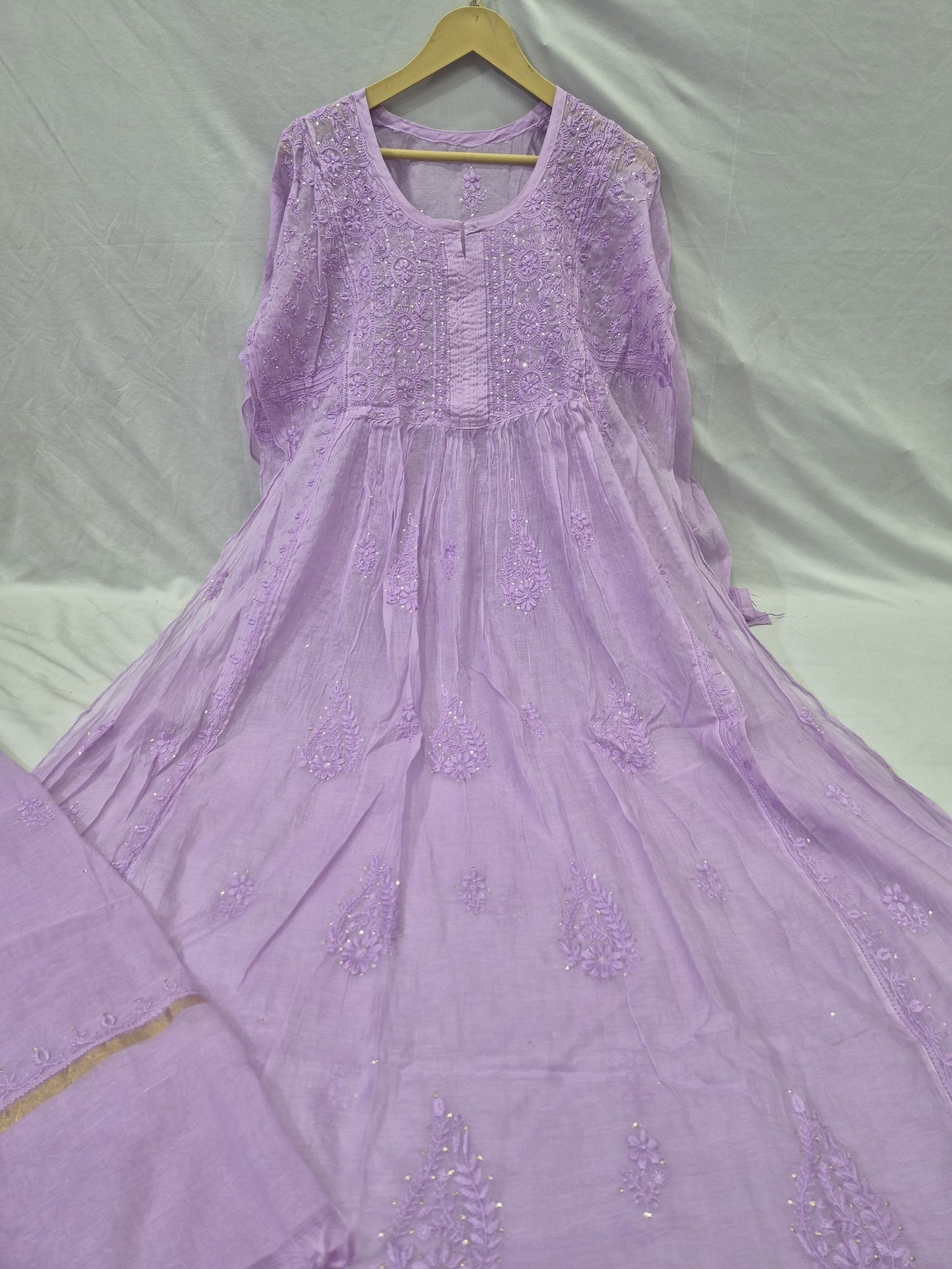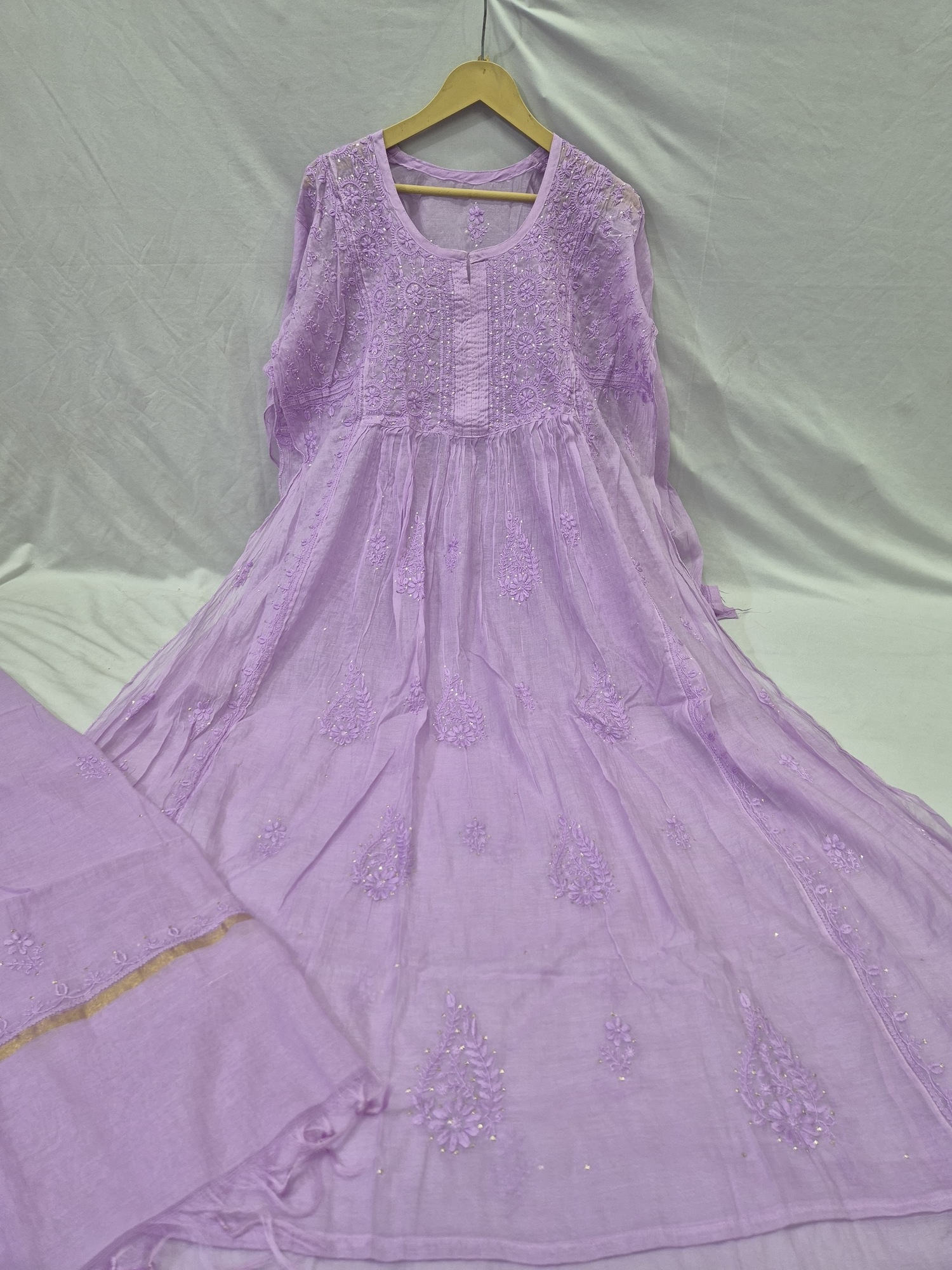This stunning semi-stitched A-line gown is crafted from luxurious Mal Chandery fabric and adorned with fine hand-embroidered chikankari and traditional mukesh work. Its timeless design blends tradition with elegance, making it perfect for festive occasions, parties, or weddings. The gown is free size and comes with a beautifully matching dupatta. Comfortable, breathable, and flattering for all body types up to 46+ inches.