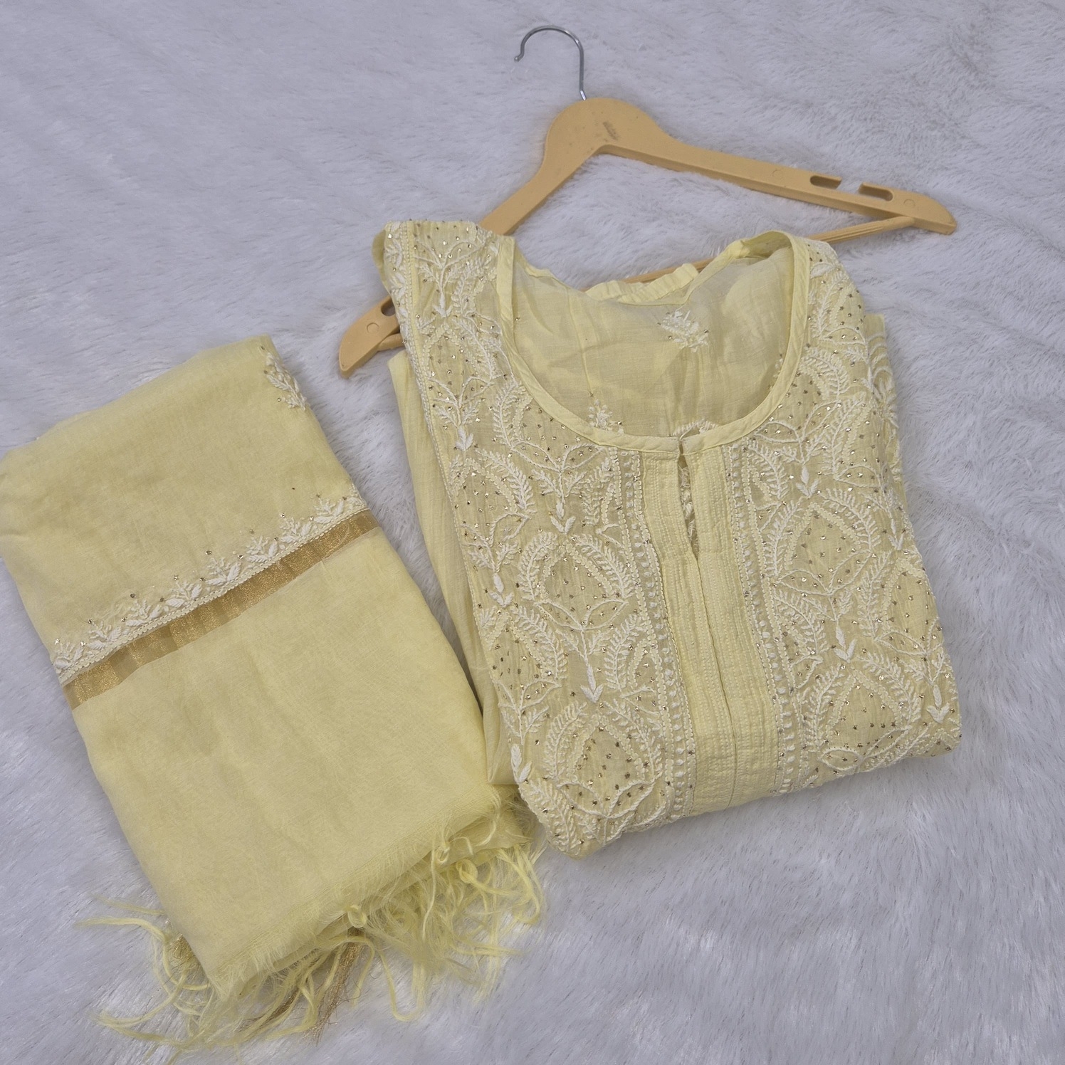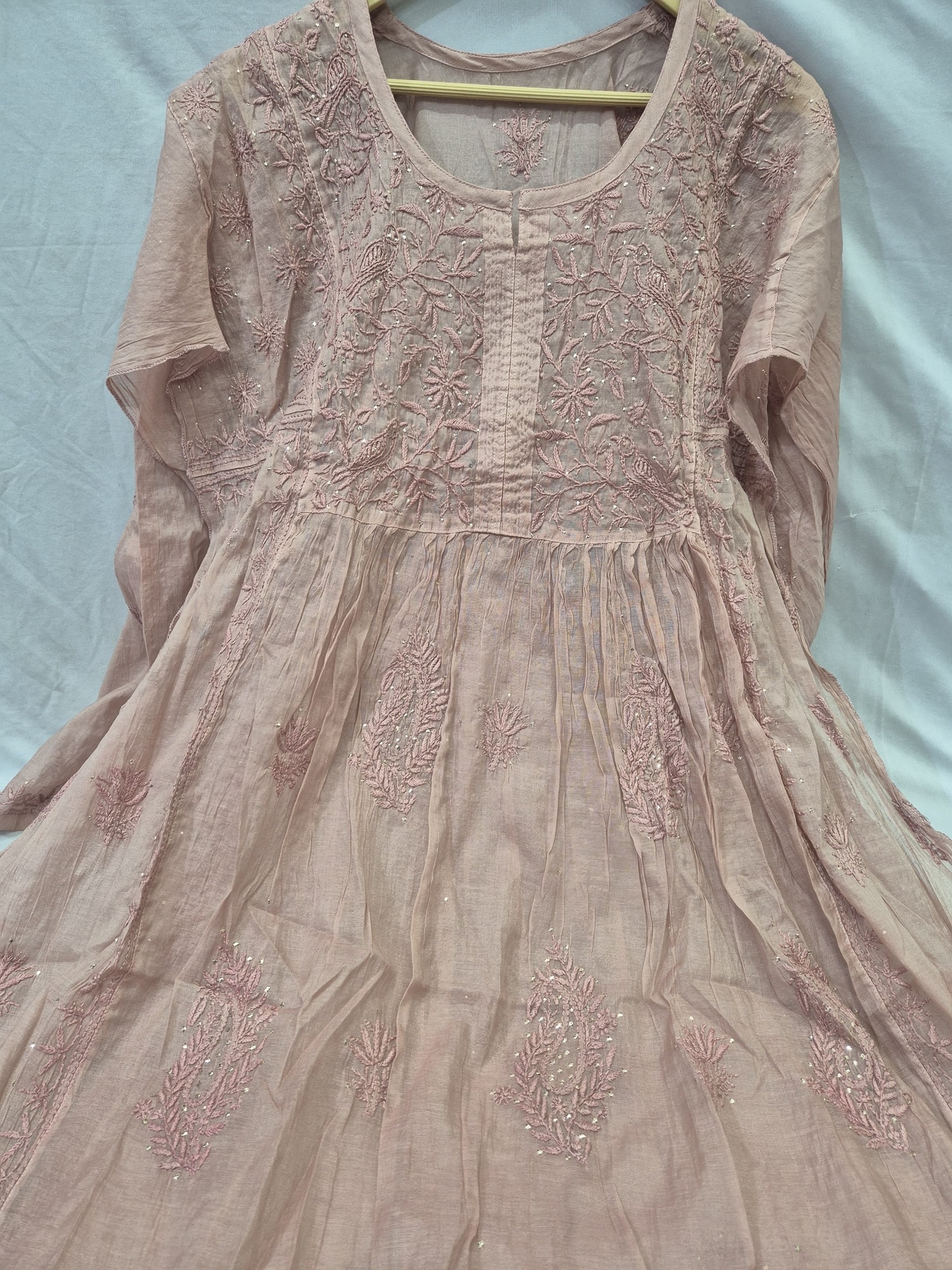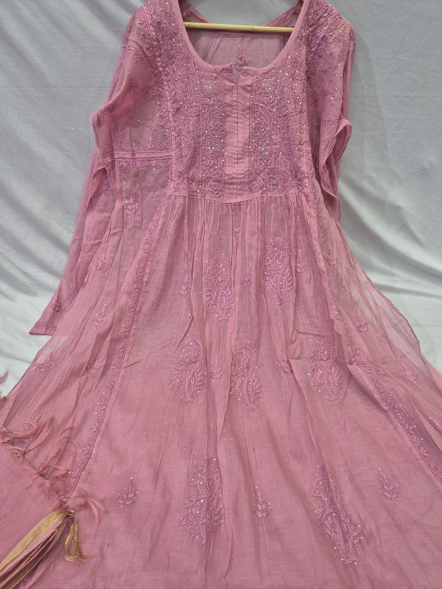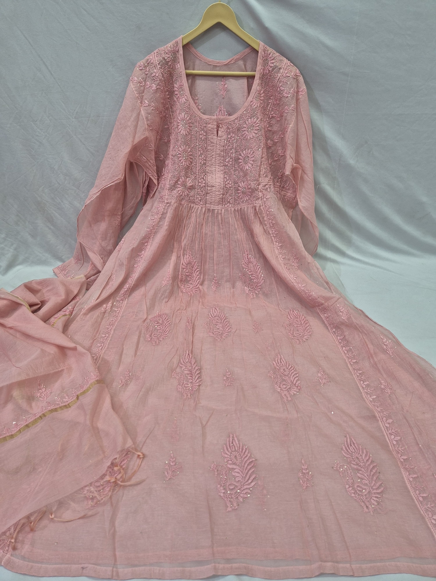 This stunning semi-stitched A-line gown is crafted from luxurious Mal Chandery fabric and adorned with fine hand-embroidered chikankari and traditional mukesh work. Its timeless design blends tradition with elegance, making it perfect for festive occasions, parties, or weddings. The gown is free size and comes with a beautifully matching dupatta. Comfortable, breathable, and flattering for all body types up to 46+ inches.