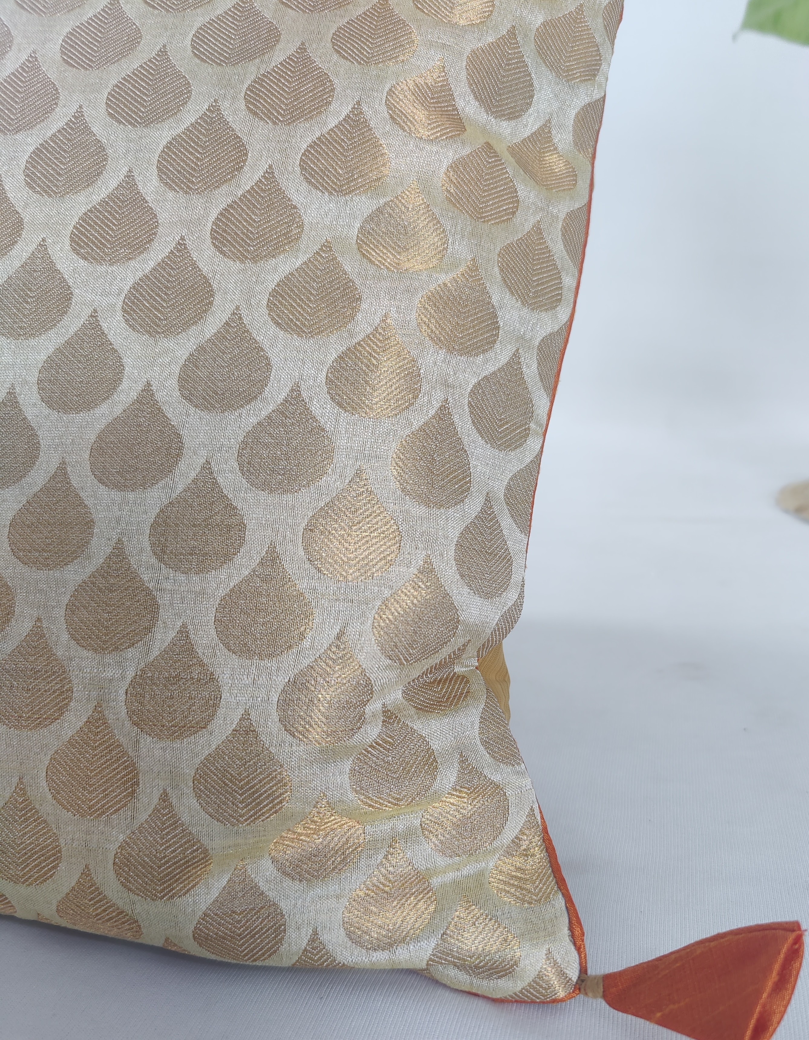 Set of 2 Decorative Gold Brocade Cushion Covers with Piping and Tassels