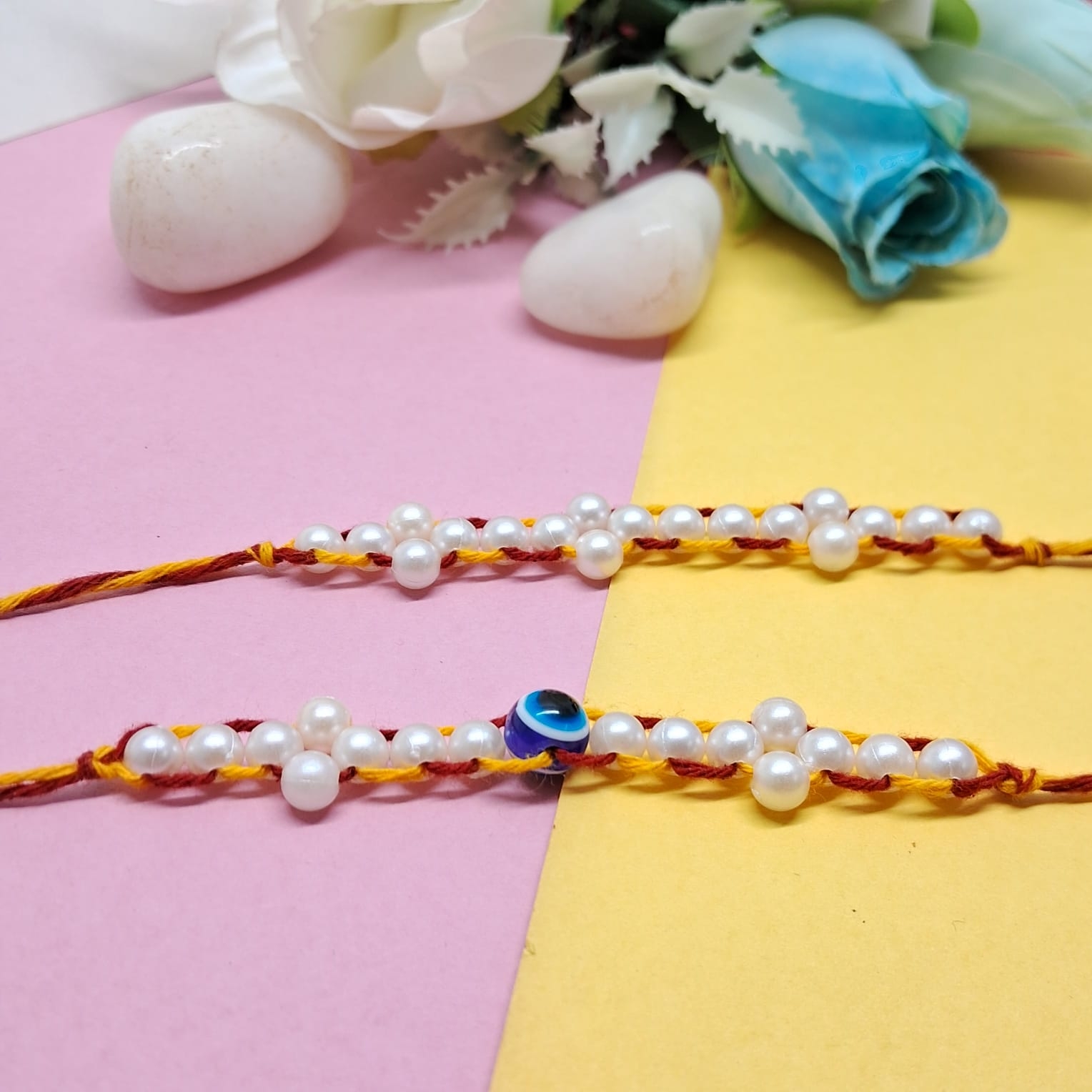 • Handcrafted Pearl Rakhi – Features elegant pearls and an evil eye bead for protection.