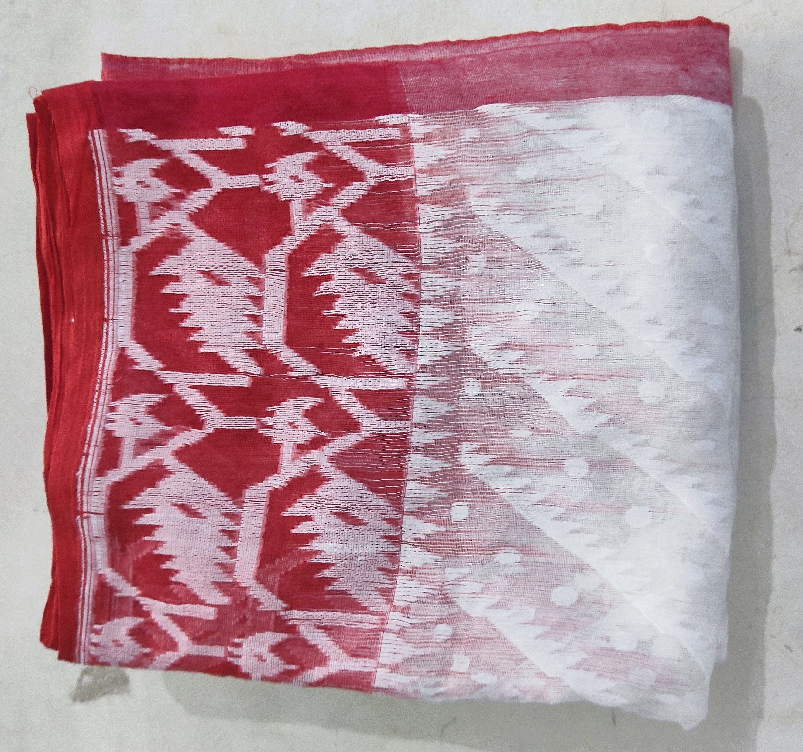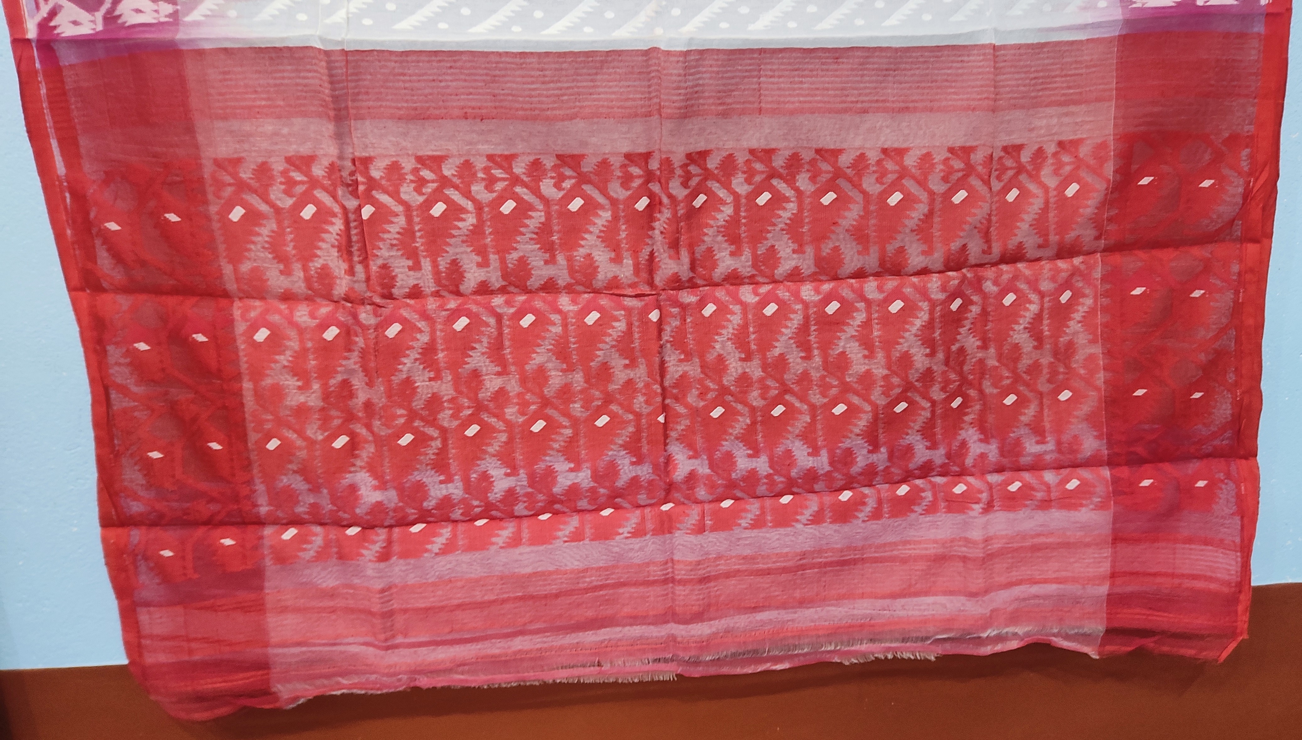 The speciality of this saree lies in its harmonious blend of the past and present. The rich tradition of the Jamdani weave is respected through the handloom process, while the inclusion of the mixed cotton/gas mercerised fabric ensures an exceptional drape and breathability. The sophisticated white and red colour palette provides a grounding, understated elegance. It is a saree that doesn't just look beautiful; it feels wonderful to wear, making it an ideal choice for long hours at a wedding or any festive gathering. It is an heirloom-quality item that speaks of a heritage of textile excellence.
