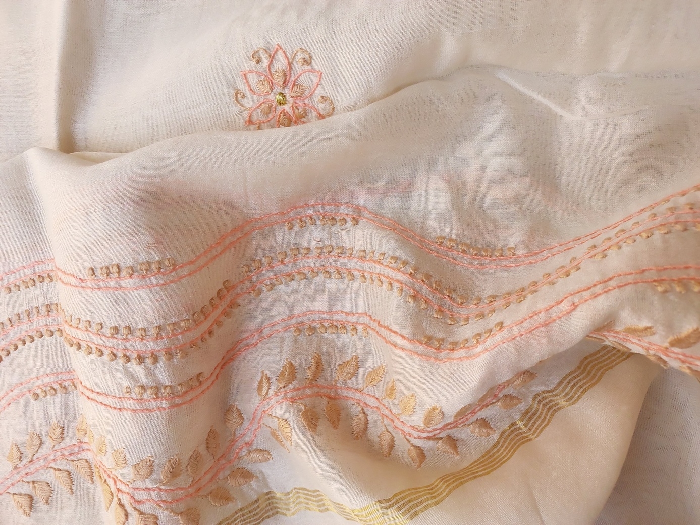 Elevate your ethnic wardrobe with this exquisite Handwoven Chanderi Dupatta, a true representation of the craftsmanship from Uttar Pradesh. Crafted with delicate Chikankari hand embroidery in peach and fawn threads, this dupatta embodies grace and elegance. The natural hue of the Chanderi fabric, complemented by the intricate border and butty pattern, makes it a versatile piece that can enhance any outfit.
